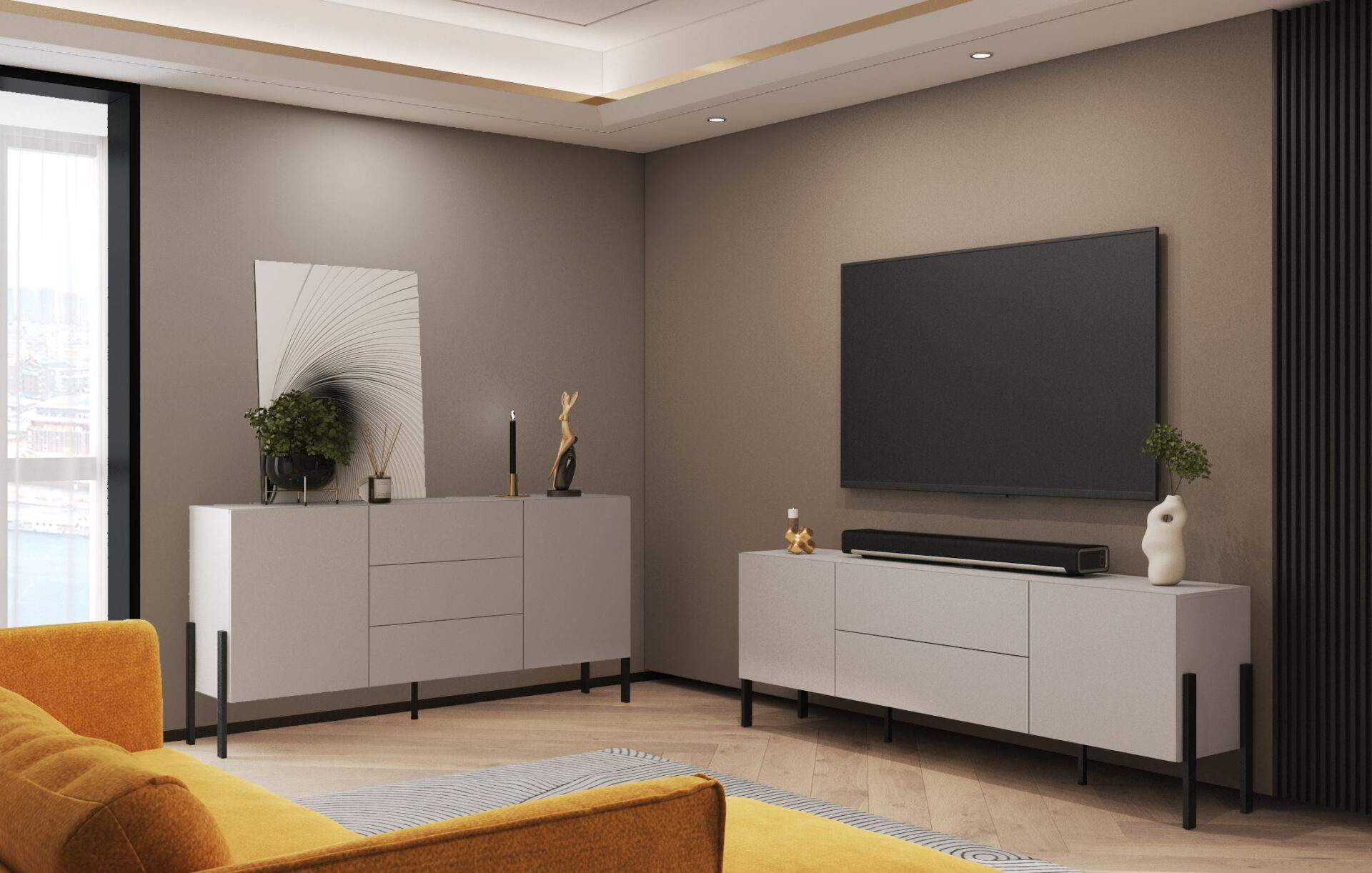 Откройте для себя уникальную тумбу под телевизор Jukon, сочетающую современный стиль и функциональность. Изготовленная из высококачественных материалов, эта элегантная тумба цвета «Кашемир» органично впишется как в классический, так и в современный интерьер. Матовая отделка придает интерьеру утонченное очарование, а минималистичный дизайн делает ее сердцем любой гостиной. Тумба под телевизор Jukon не только красива, но и практична. Благодаря вместительному дизайну шириной 207 см, высотой 70 см и глубиной 40 см, она предоставляет достаточно места для всех ваших необходимых мультимедийных устройств и декоративных предметов. Дверцы открываются с помощью современной системы «нажатие», которая добавляет дополнительный элемент комфорта и элегантности вашему интерьеру. Особенно привлекательны матовые черные ножки тумбы, придающие ей солидный и современный характер. В сочетании с корпусом и передней панелью цвета «Кашемир» она создает гармоничное целое, способное украсить любую комнату. Она идеально сочетается с другой мебелью, позволяя вам создать уникальный и персонализированный декор в вашем доме.