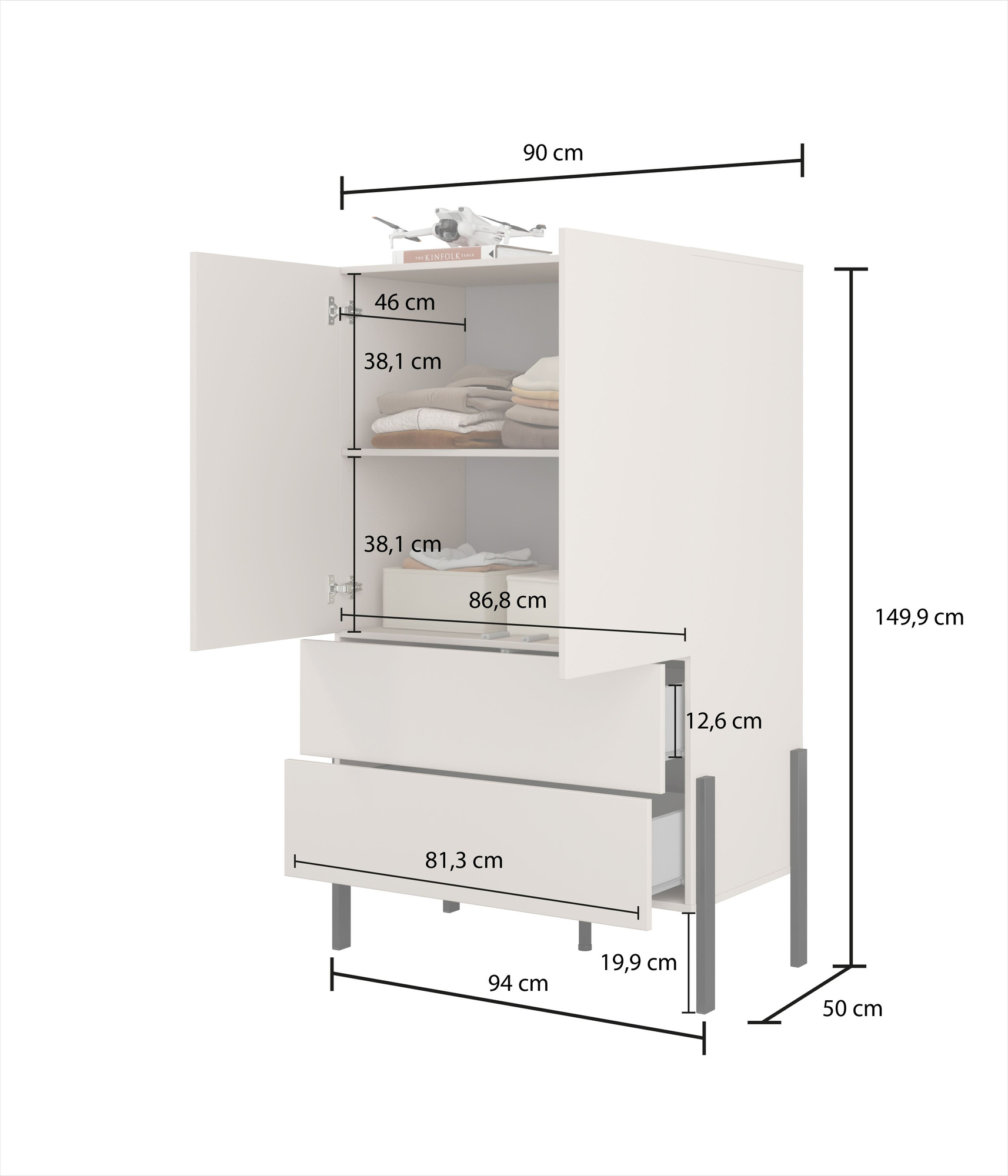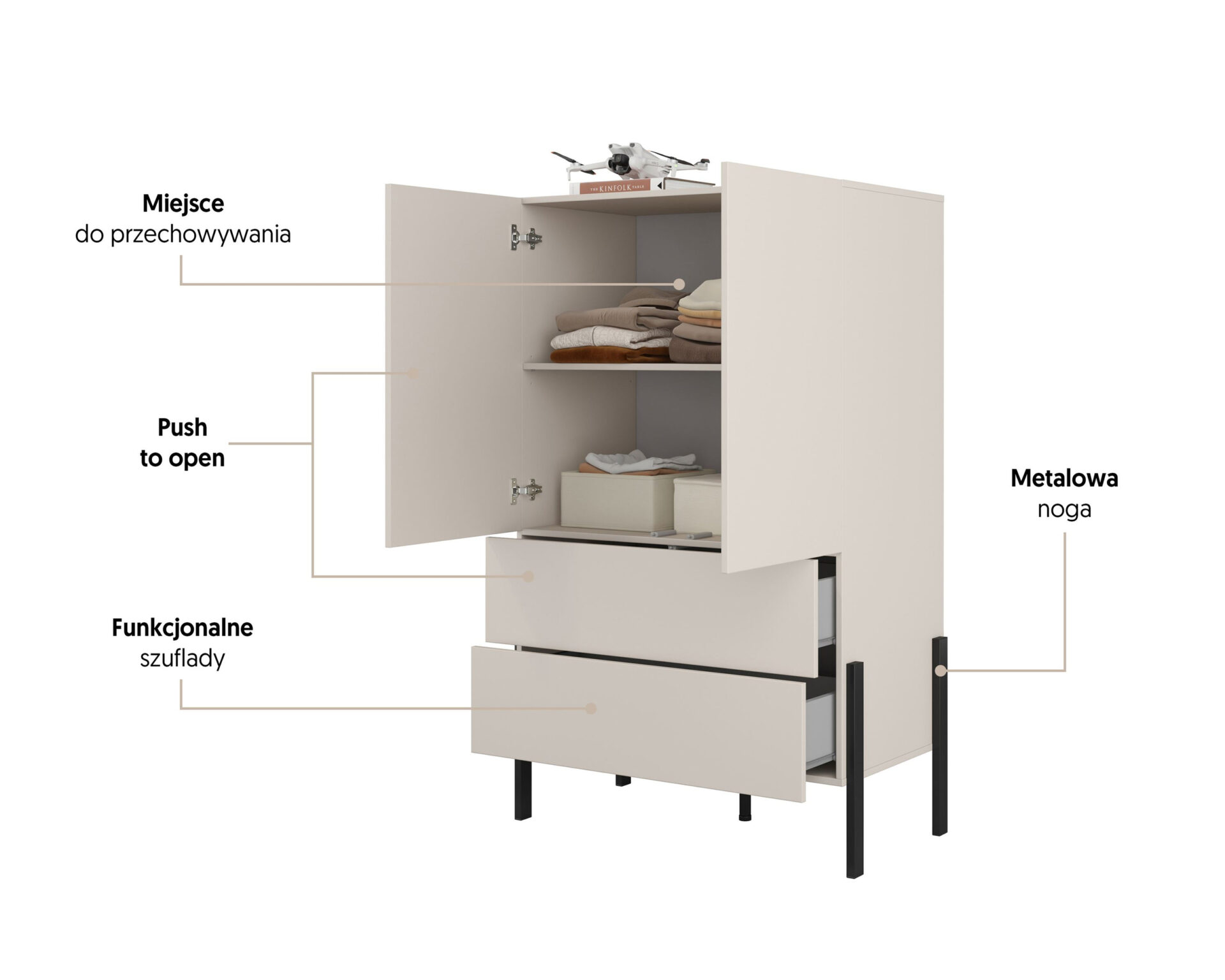Бельевой шкаф Jukon S — идеальный выбор для тех, кто ценит не только функциональность, но и изысканный дизайн. Изготовленный из высококачественной ламинированной плиты кашемирового цвета, он добавит элегантности и современности любому интерьеру. Его сдержанная цветовая гамма идеально гармонирует с различными вариантами расстановки мебели, создавая гармоничное пространство для приятного отдыха. Матовое черное основание с металлическими ножками не только обеспечивает устойчивость, но и придает всей конструкции современный вид. Бельевой шкаф размером 90 см в ширину, 150 см в высоту и 50 см в глубину предлагает исключительную вместительность, занимая при этом минимум места. Благодаря продуманному дизайну он идеально подходит для спальни, прихожей или гардеробной, предлагая стильное хранение одежды и аксессуаров. Система открывания push-to-open — это инновационное решение, сочетающее эстетику и функциональность. Она делает доступ к содержимому шкафа невероятно легким, а сам шкаф приобретает современный вид. Полки кашемирового цвета идеально сочетаются с остальными элементами, создавая гармоничную и стильную форму, которая порадует каждого ценителя элегантного дизайна.
