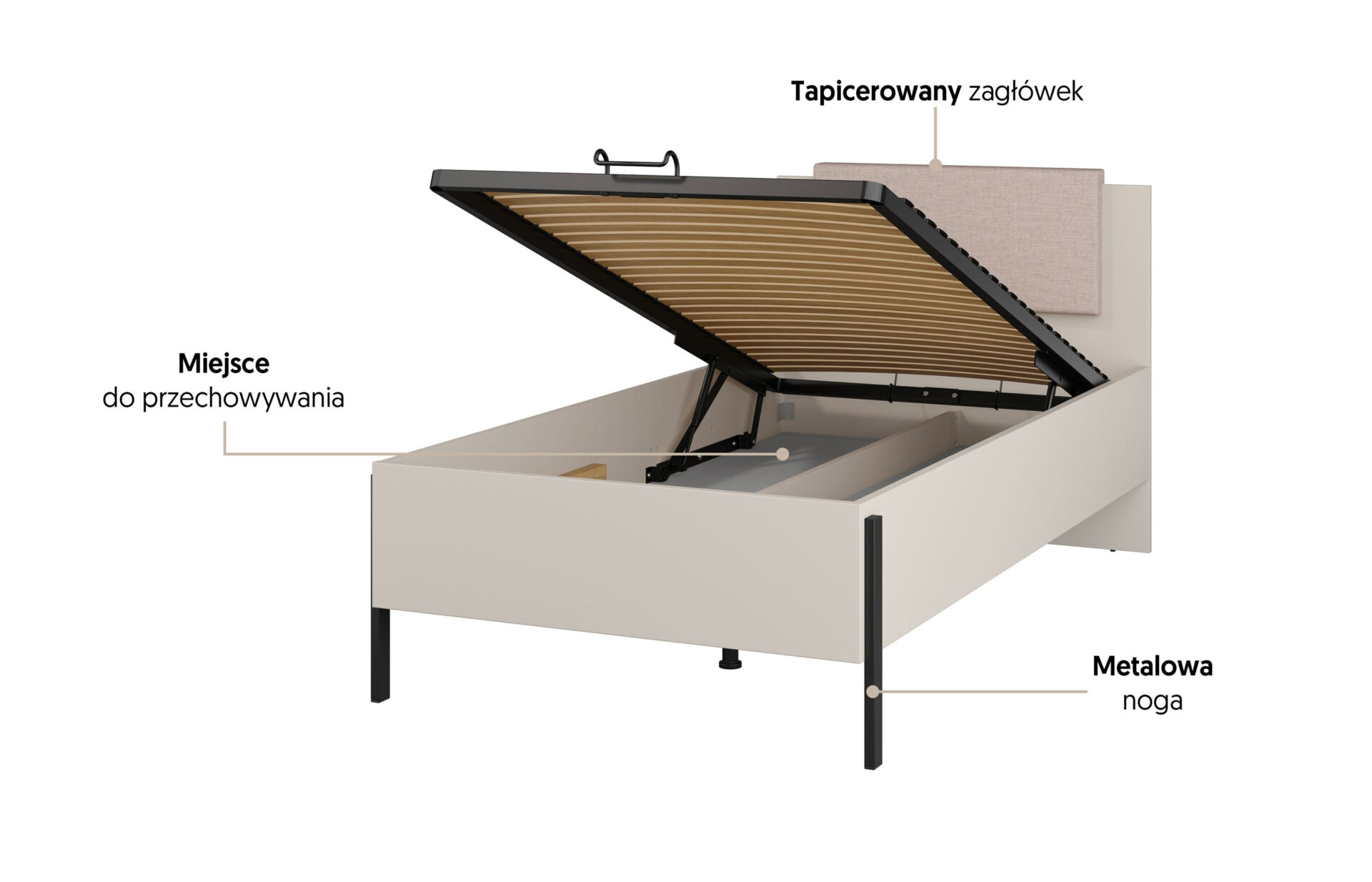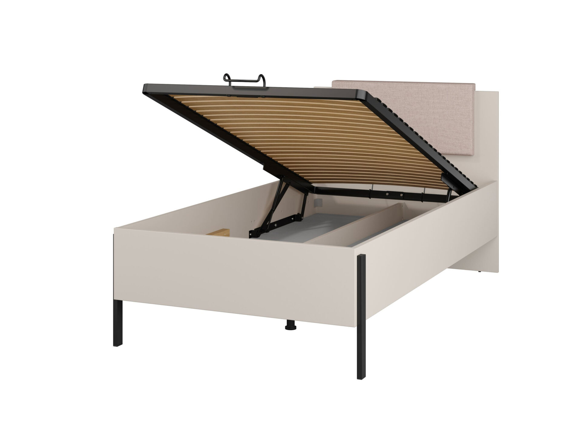 Jukon S – 100 cm lova su daiktadėže, kašmyro spalvos, juodos metalinės kojelės