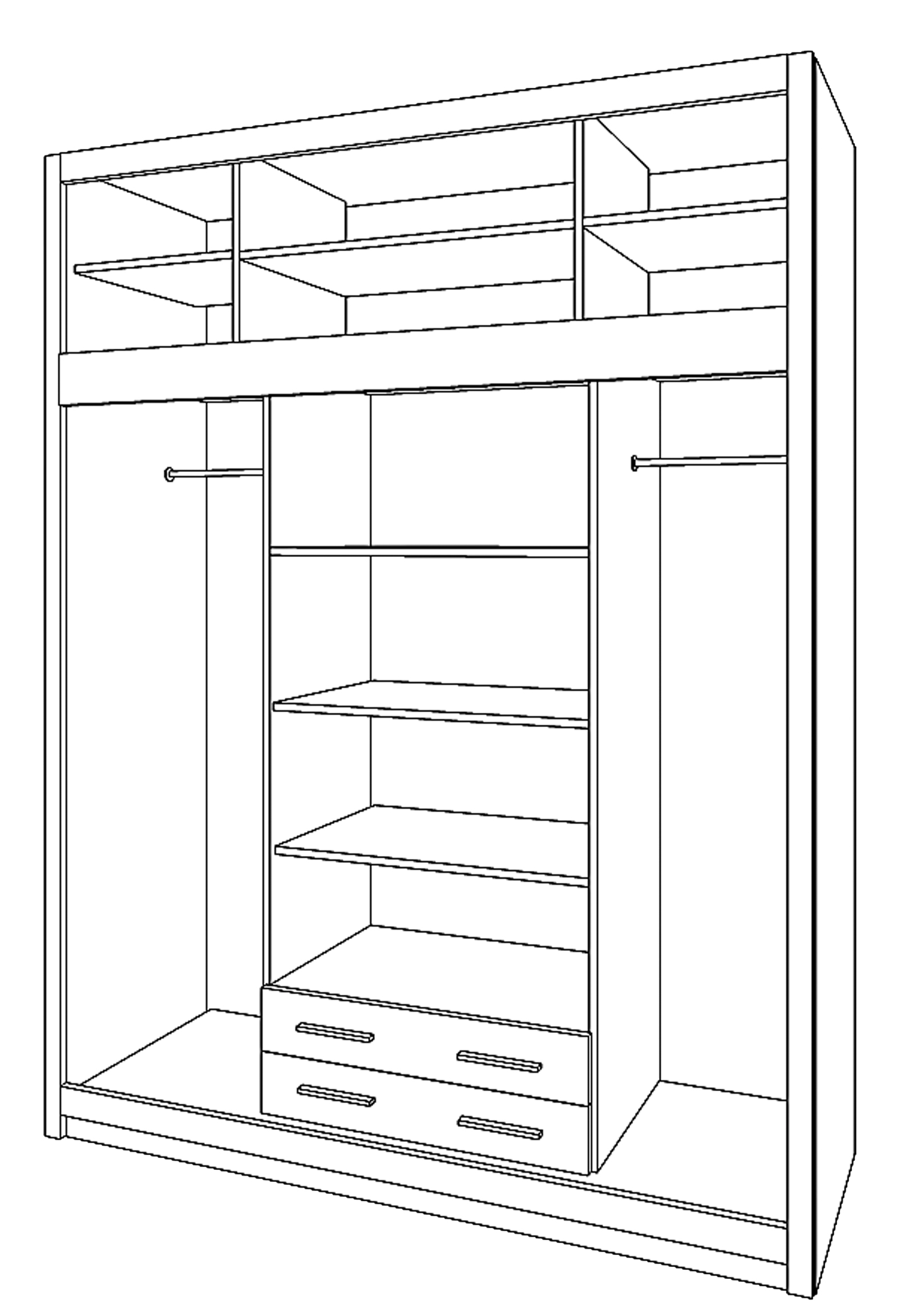 Внутреннее устройство шкафа – трехсекционный шкаф (средняя секция с полками | правая и левая стороны с вешалкой для одежды)