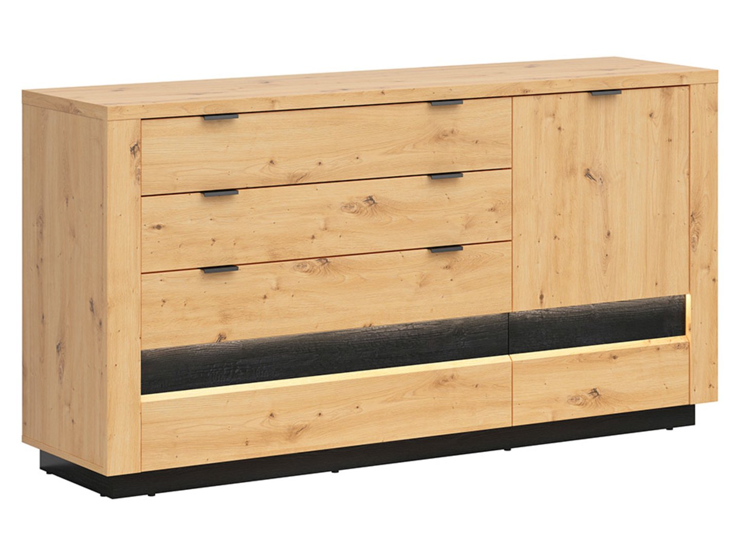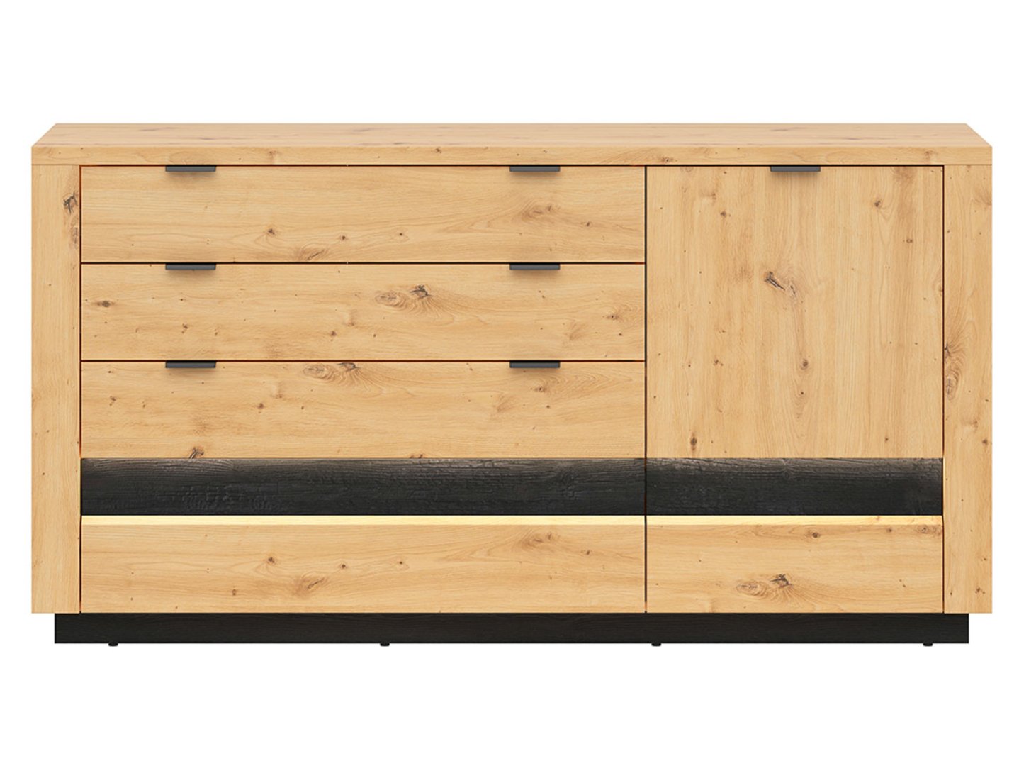 OSTIA komoda su vienomis durimis ir keturiais stalčiais, 161 cm, ąžuolo imitacija / juoda blizgi spalva