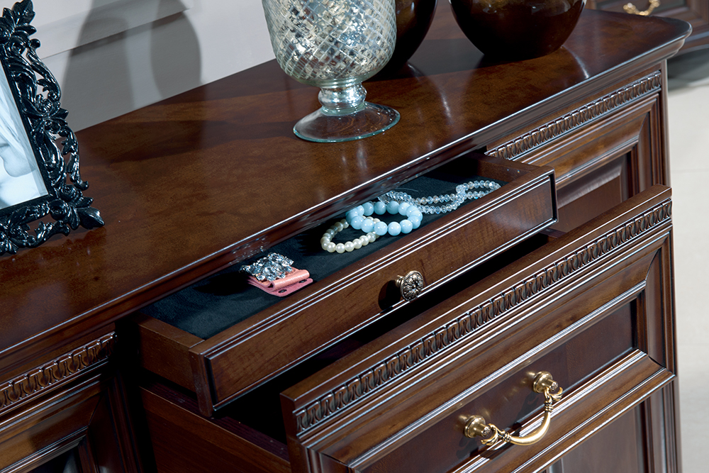 Изящные формы подчеркиваются высоким качеством используемых материалов (древесина ольхи и элементы из шпона ольхи). Мебель доступна в четырех цветовых вариантах: коричневый, белый, белая патина, кремовый, кремовая патина. Материал фасада: древесина ольхи и шпон ольхи.