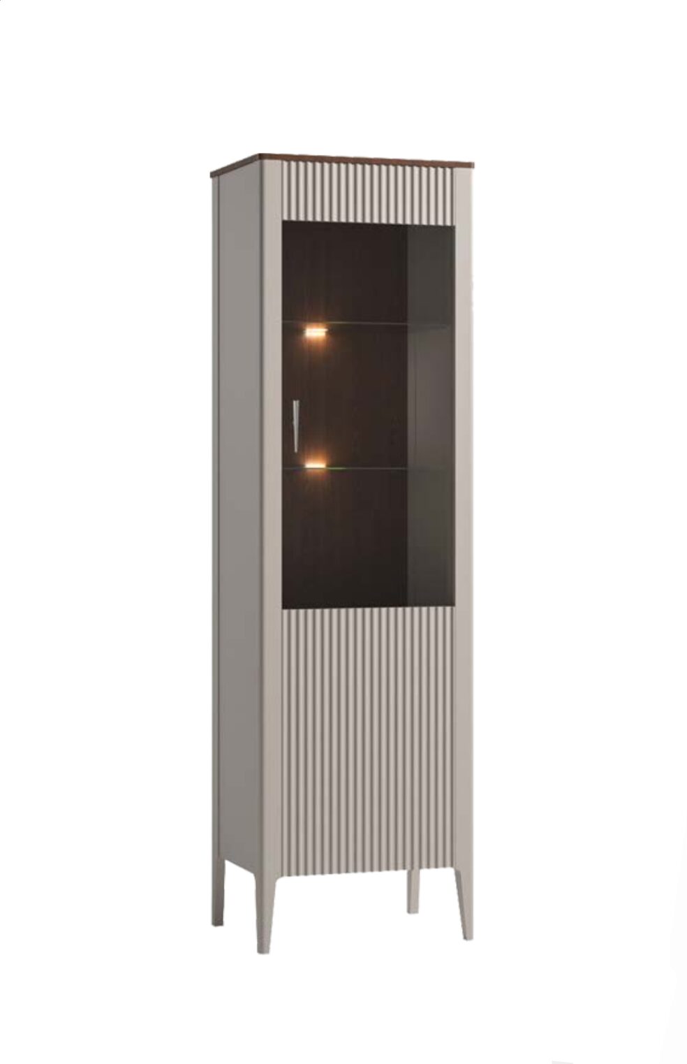 Высокий буфет WENECJA WE-W1/2 из эксклюзивной коллекции с 3D-фасадом и уютной отделкой под шоколадный дуб создает современный характер. Это воплощение современной эстетики, пронизанное ностальгией по прошлому. Темная задняя стенка из шоколадного дуба, дымчатое стекло и ненавязчивая подсветка полок в витринах придают им таинственный шарм.