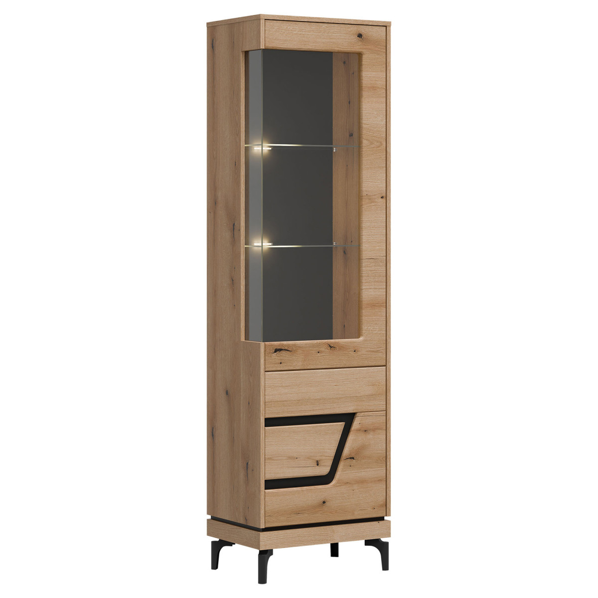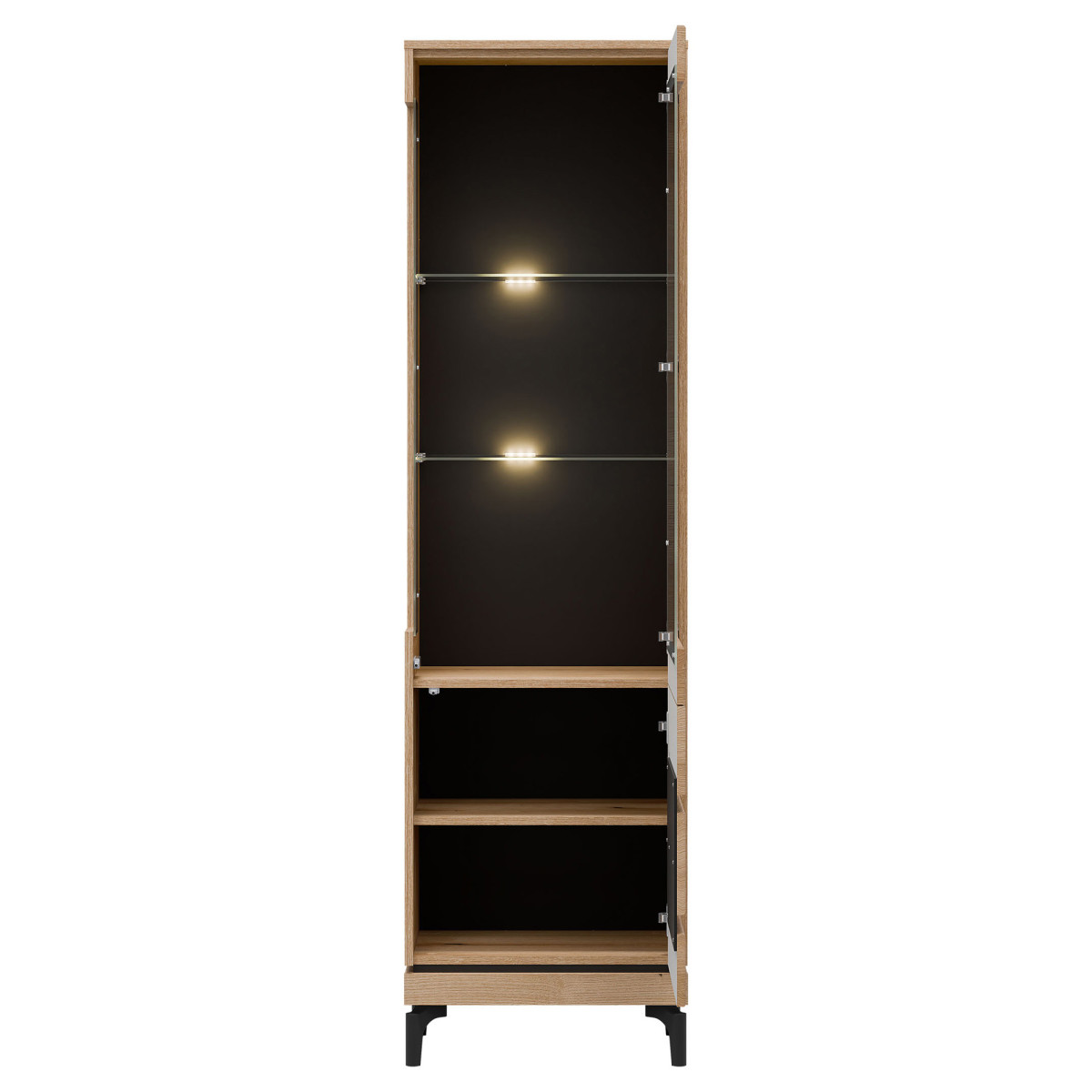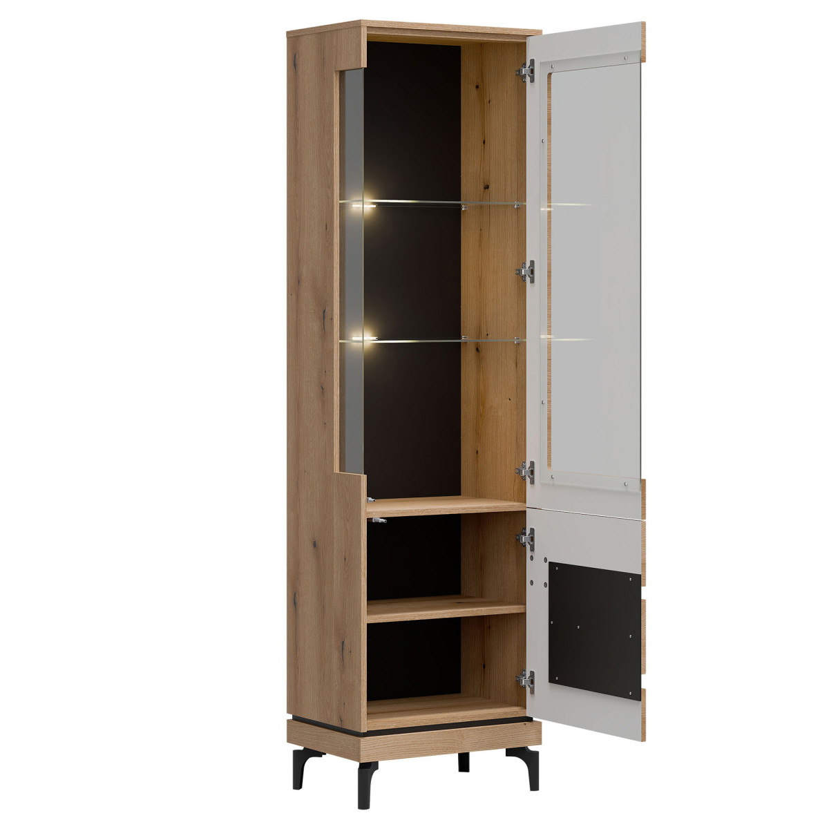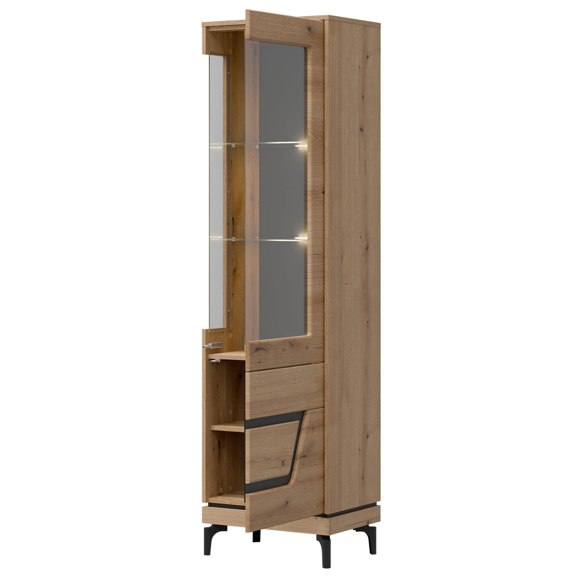 Витрина серии Kris, модель KS06, в цвете “Evoke Oak/Black”, сочетает в себе современный дизайн и функциональность. Это уникальное дополнение к вашей гостиной, которое добавит элегантности и стиля. Стеклянные дверцы идеально подходят для демонстрации коллекции книг, посуды или декоративных предметов. Многочисленные полки позволяют хранить различные мелкие предметы, поддерживая порядок. Дополнительным преимуществом этой витрины является светодиодная подсветка, которая ненавязчиво освещает хранящиеся предметы, добавляя визуальный эффект и атмосферу в комнату.