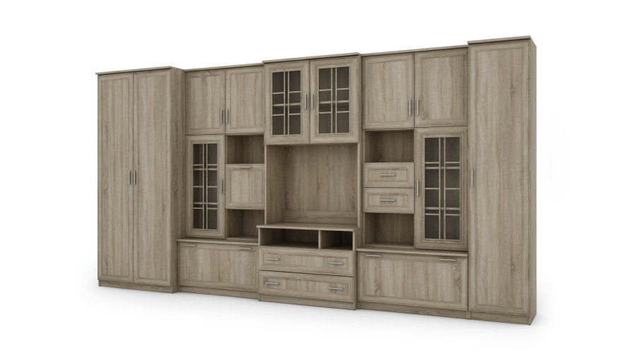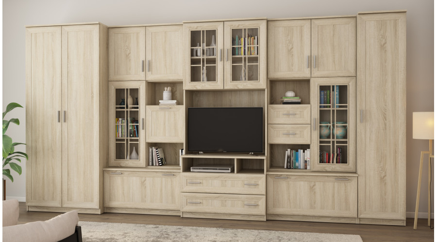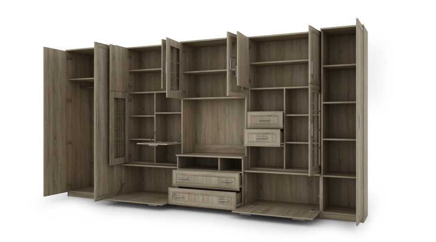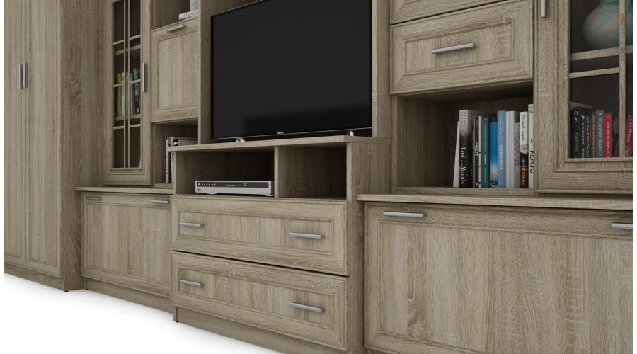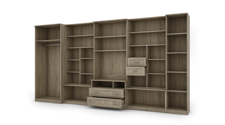 В комплект входит очень вместительный шкаф, оборудованный вешалкой и полкой, а также гардеробная колонна с пятью полками для удобной организации одежды, текстиля и аксессуаров. Центральная секция спроектирована как функциональная зона для телевизора с большим углублением для телевизора и тумбой для мультимедийной техники. Выдвижные ящики, расположенные в нижней части шкафа, обеспечивают дополнительное место для хранения повседневных вещей.
