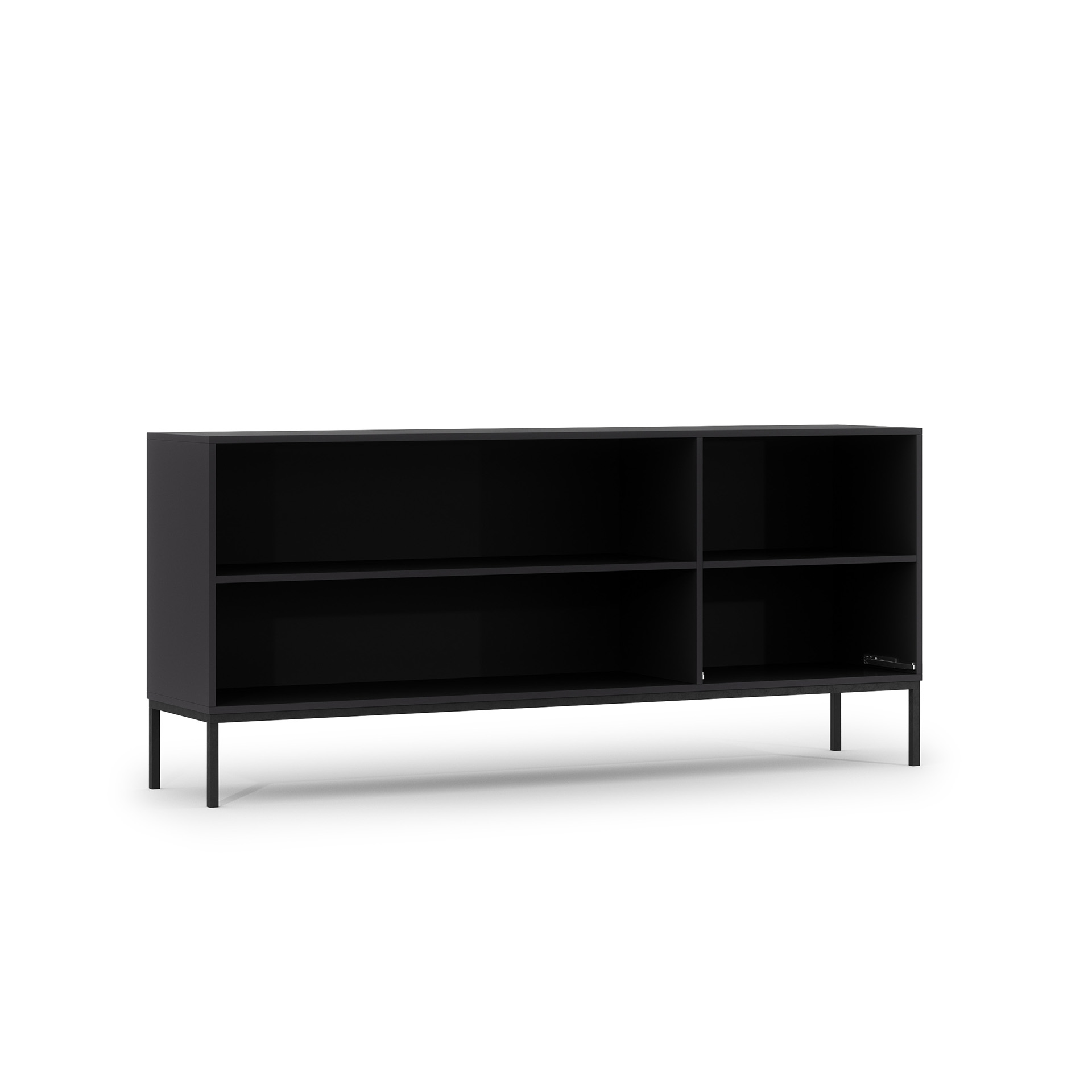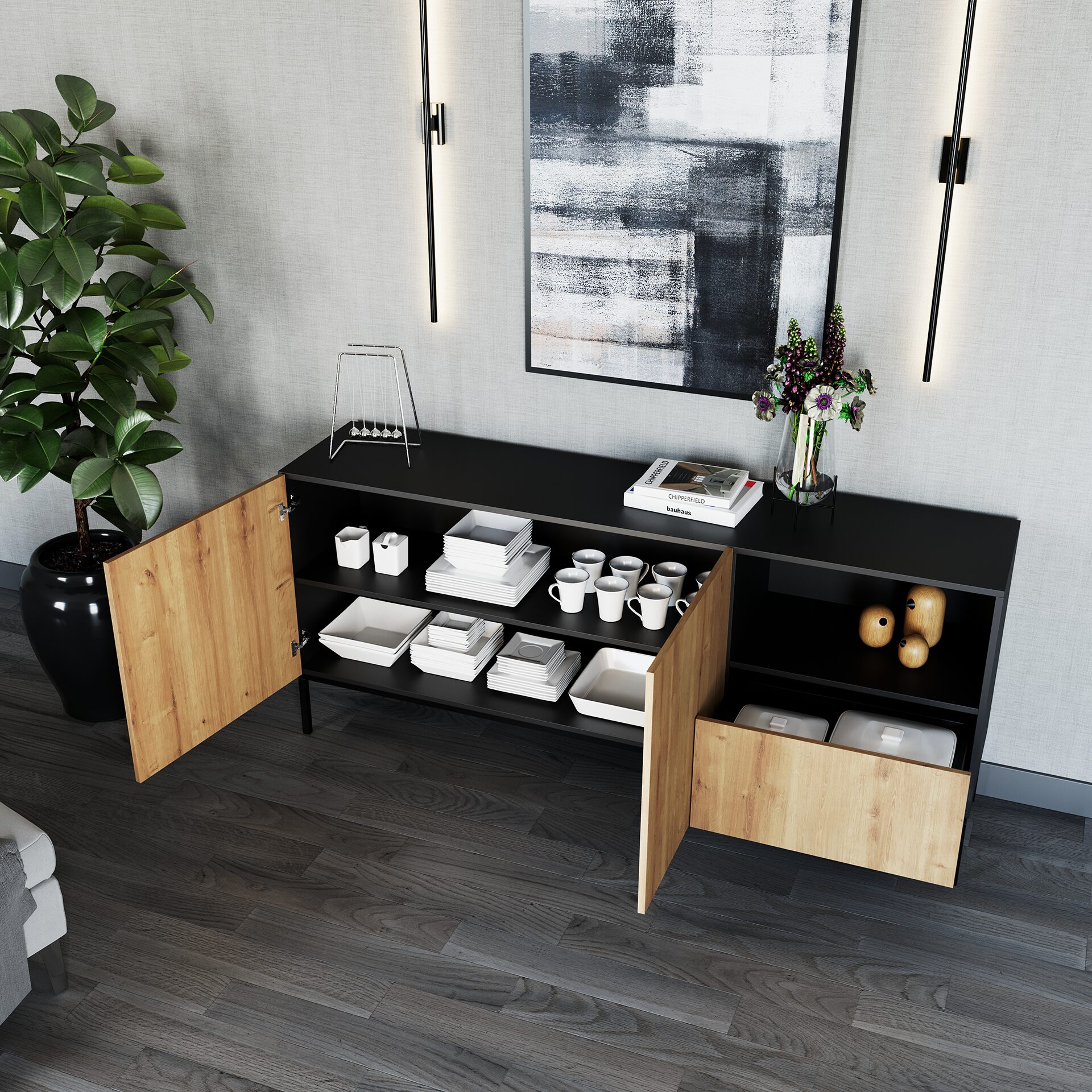 Большой комод Lanzzi с одним просторным ящиком имеет лаконичный силуэт и нейтральную, однотонную отделку, которая сочетается практически с любой цветовой палитрой. Ящик открывается плавно и практически бесшумно благодаря функции плавного закрывания. Кроме того, комод оснащен двумя большими полками, скрытыми за парой запирающихся дверок. Третья полка открыта, что позволяет разместить фотографии или свечи. Комод Lanzzi шириной почти два метра позволяет хранить большое количество постельного белья, рубашек, брюк и других необходимых вещей. Матовые цвета мебели доступны в следующих вариантах: матовый черный в сочетании с дубом ручной работы или просто матовый черный. Это позволяет выбрать между популярным черным цветом и натуральным деревом. Черный вариант дополнен золотыми ручками. Второй вариант открывается с помощью петель “нажать для открытия”, для доступа к полкам или ящику комода Lanzzi требуется лишь легкое нажатие. Черные металлические ножки высотой 20 сантиметров придают мебели устойчивость и являются интересным дополнением. Доступны в двух цветах. Высота: 80 см, Глубина: 40 см, Ширина: 180 см, Вес: 51 кг. Варианты материалов: матовый черный + дуб ручной работы / матовый черный + матовый черный. Цвет каркаса: черный. Материал: МДФ. Материал ножек: металл. Высота ножек: 20 см. Количество ящиков: 1. Количество дверей: 2. Количество закрытых полок: 2. Количество открытых полок: 1.