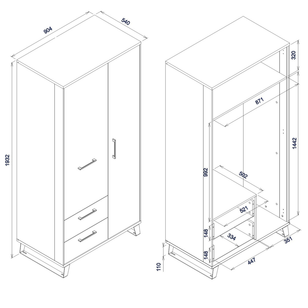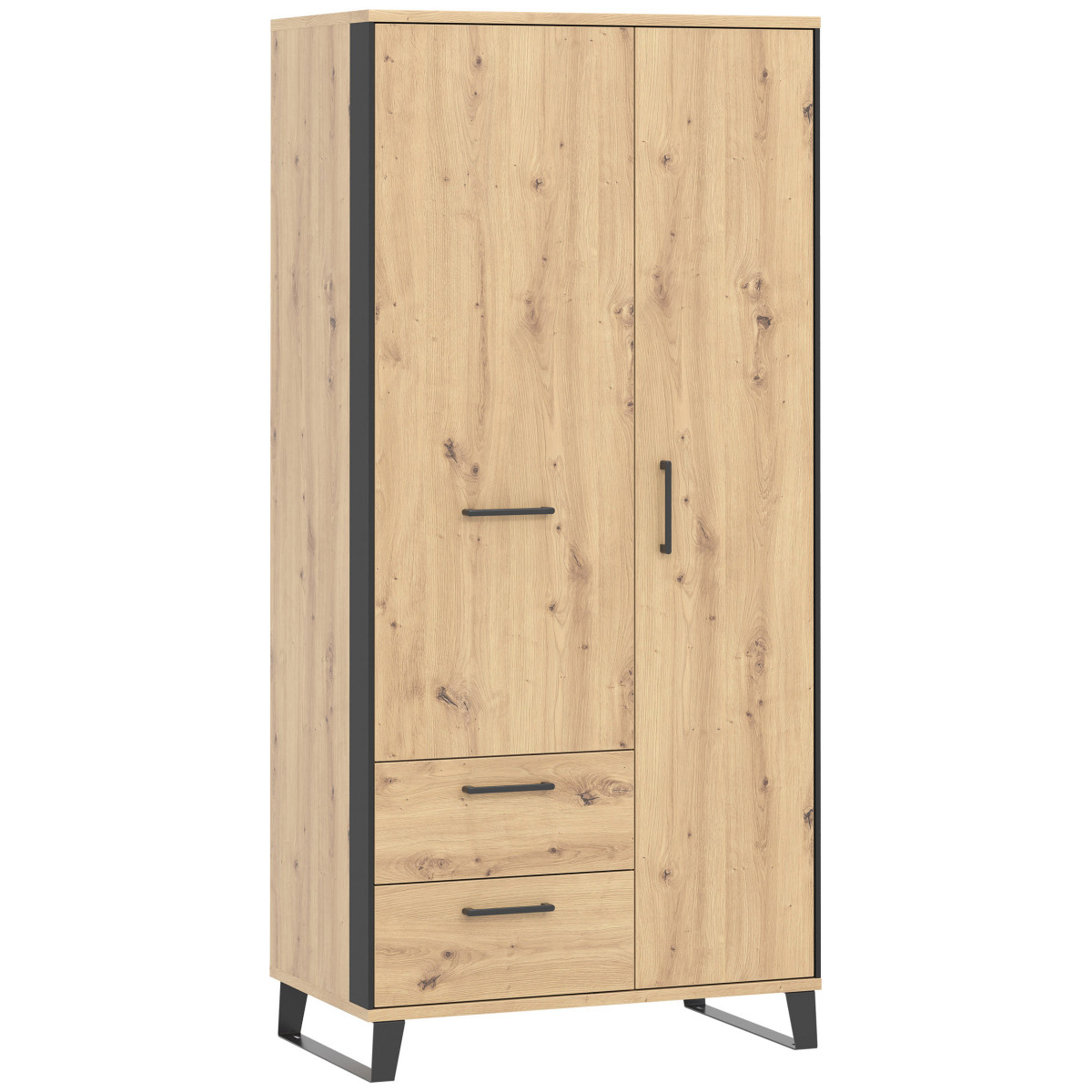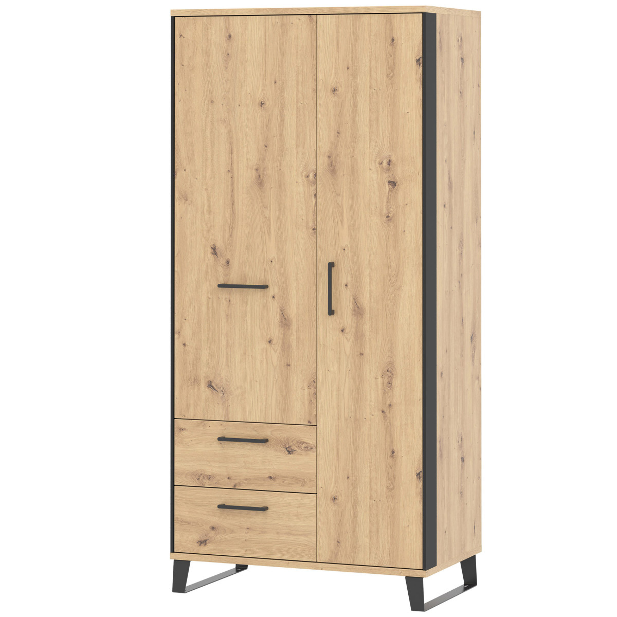 Ширина 90,5 см, глубина 54 см, высота 193,5 см, вес изделия с упаковкой 75,85 кг. Код/символ производителя LT09. Название коллекции: loft. Название в системе b2b: LOFT LT-9 artisan oak/black. Комплектация шкафа: 4. Тип изделия: Loft. Комплектация: Инструкция по сборке / аксессуары для сборки. Сборка: Самостоятельная сборка. Цвет корпуса: Дуб ручной работы / Черный. Материал/тип/толщина корпуса: ДСП 16 мм / Полка: МДФ 16 мм. Материал/тип/толщина верхней части корпуса: ДСП 22 мм. Материал/тип/толщина нижней части корпуса: ДСП 22 мм. Цвет полок: Дуб ручной работы. Материал/тип/толщина полок: ДСП 16 мм. Тип полок: 1. Материал/тип/толщина задней стенки: ДСП HDF 2,5 мм. Цвет видимой части задней стенки: Черный. Цвет передней части: Дуб ручной работы. Материал/тип/толщина передней части: ДСП 16 мм. Передняя петля: 35 мм, регулировка в трех плоскостях. Передняя ручка/материал/цвет: Пластик. Черный. Система плавного закрывания дверей. В стандартной комплектации. Направляющие ящиков полного выдвижения. Ножки / отделка / цвет. Нерегулируемые / металл / черный. Высота ножек: 110 мм. Количество дверей: 2. Количество ящиков: 2. Количество закрытых ниш: 2. Комплектация: Стандартная. 1 вешалка для одежды.