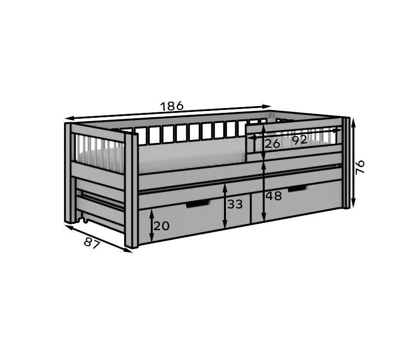 Детская кровать Orio — идеальное решение для братьев и сестер или детей, которым нужно больше места. Двуспальная кровать доступна в двух размерах: 180×80 см и 200×90 см, что позволяет адаптировать ее к различным потребностям и размерам комнаты. Изготовленная из прочных материалов, кровать представлена в двух привлекательных цветах: белом и сосновом, что позволяет легко подобрать ее к любому интерьеру. Дополнительным преимуществом являются два отсека для хранения под кроватью, которые обеспечивают дополнительное место для хранения постельного белья, игрушек и других вещей, поддерживая порядок в детской комнате. Кровать Orio сочетает в себе функциональность и эстетику, предлагая комфортный ночной сон и практичные решения для повседневной жизни.