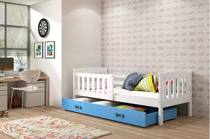 KUBUŚ viengulė vaikiška lova 80×160 su čiužiniu ir stalčiumi, balta/mėlyna