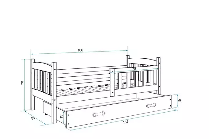 Каркас кровати – изготовлен из сосновой древесины, покрытой лаком на водной основе. Комплектующие для сборки – быстрая и простая сборка. Матрас – толщиной 7 см, со съемным чехлом, из кондиционирующего волокна и пенополиуретана. Чехол – стеганая гипоаллергенная полиэстерная ткань с молнией. Каркас – мы единственная компания, предлагающая каркас из пружинных ламелей, изготовленный из березовой древесины, с ручкой из ПВХ на металлической планке, с использованием системы «клик-клак» (быстрая сборка). Плита HDF. Ящик – изготовлен из ДСП. Ручка ящика – из ПВХ. Колесики ящика. Радиус скругления – R2. Максимальная нагрузка – 100 кг. Сертифицированная кровать – качество и безопасность соответствуют стандартам TUV.