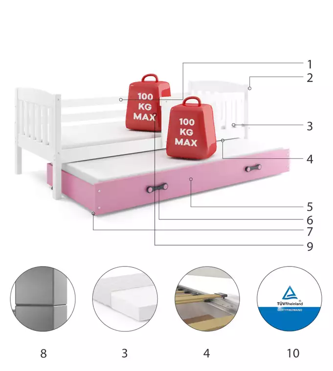 Каркас кровати – изготовлен из сосновой древесины, покрытой лаком на водной основе. Комплектующие – быстрая и простая сборка. Матрасы – толщиной 7 см (2 шт.), со съемным чехлом, из вспененного полиэстера и синтетического волокна. Чехол – стеганая гипоаллергенная полиэстерная ткань с молнией. Каркас – мы единственная компания, предлагающая каркас из пружинных березовых ламелей, крепящихся с помощью ПВХ-ручки на металлической планке, с использованием системы «клик-клак» (быстрая сборка). Ящик – изготовлен из ДСП, с дополнительной функцией спального места. Ручка ящика – из ПВХ. Колесики ящика. Радиус скругления – R2. Максимальная нагрузка – 100 кг на ярус. Сертифицированная кровать – качество и безопасность соответствуют стандартам TUV.