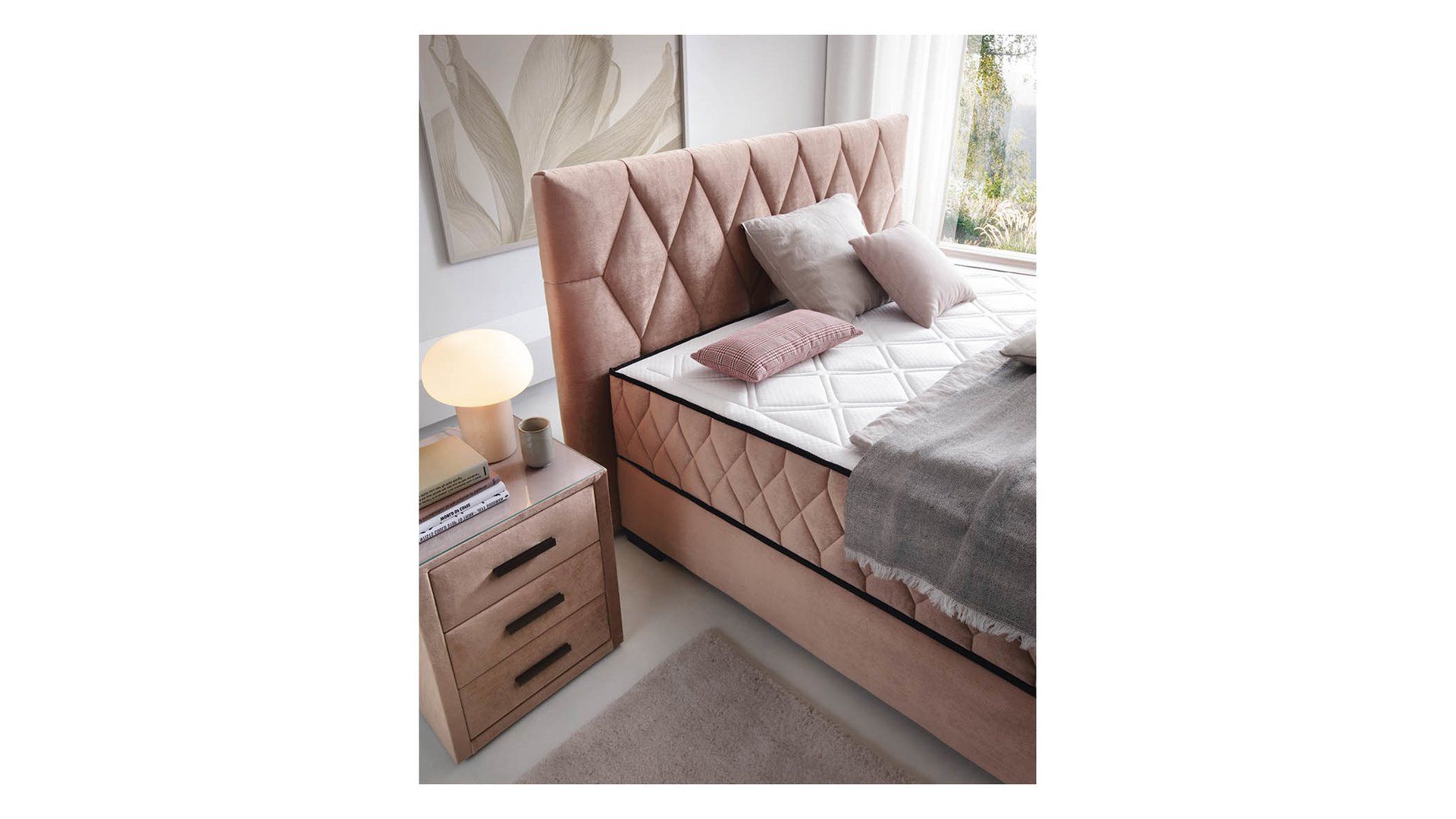 Product code FL-LO_KT-REVE-140X200-G2-AMON_21 Length 213 cm Width 165 cm Height 114 cm Seat height 59 cm Collection Reve Color Amon 21 Shade pink Style glamorous Material velvet Sleeping function with sleeping function Sleeping area 140×200 Container with container Filling pocket spring Manufacturer Black Red White Furniture type Beds VAT tax 23%