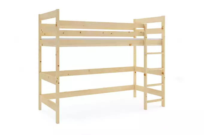 Двухъярусная кровать-мезонин. В комплект входит: каркас кровати из нелакированной сосновой древесины. Матрас: отсутствует. Защитный бортик. Мебельные аксессуары с инструкцией. Каркас – мы предлагаем каркас из пружинных березовых реек, крепящихся с помощью ПВХ-кронштейна к металлической планке с использованием системы «клик-клак» (быстрая сборка). Закругленные края R2 – закругленные края кровати эффективно снижают риск травм, защищая ребенка от ссадин и ушибов во время игр или подъема. Максимальная нагрузка: 100 кг.
