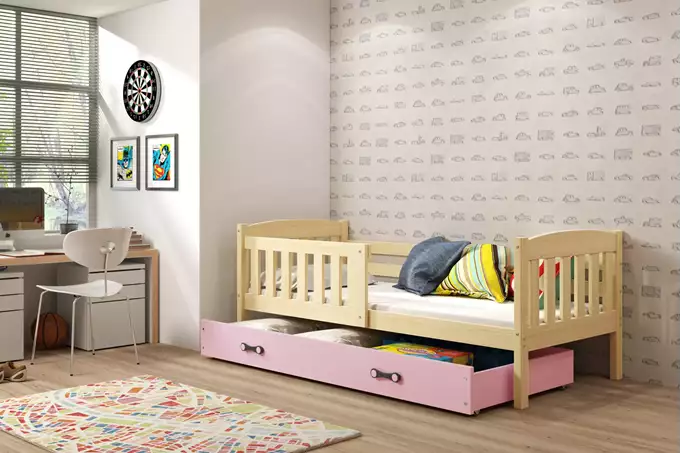 Каркас кровати – изготовлен из сосновой древесины, покрытой лаком на водной основе. Комплектующие для сборки – быстрая и простая сборка. Матрас – толщиной 7 см, со съемным чехлом, из кондиционирующего волокна и пенополиуретана. Чехол – стеганая гипоаллергенная полиэстерная ткань с молнией. Каркас – мы единственная компания, предлагающая каркас из пружинных ламелей, изготовленный из березовой древесины, с ручкой из ПВХ на металлической планке, с использованием системы «клик-клак» (быстрая сборка). Плита HDF. Ящик – изготовлен из ДСП. Ручка ящика – из ПВХ. Колесики ящика. Радиус скругления – R2. Максимальная нагрузка – 100 кг. Сертифицированная кровать – качество и безопасность соответствуют стандартам TUV.