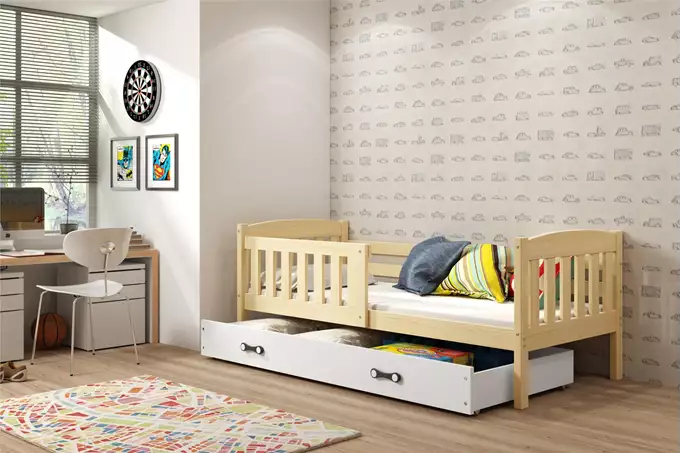 KUBUŚ viengulė jaunimo lova 80×190 su stalčiumi, pušis/balta