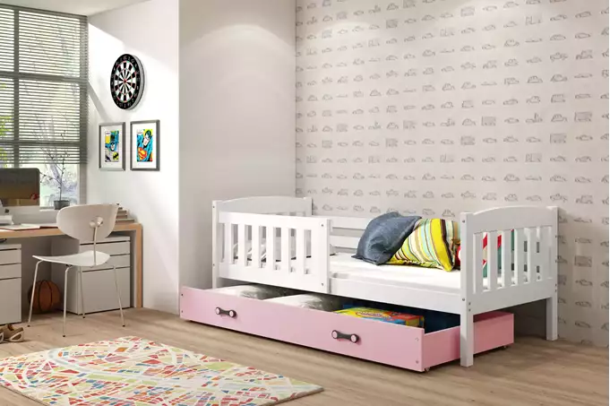 KUBUŚ jaunimo viengulė lova 90×190 su stalčiumi, balta/rožinė