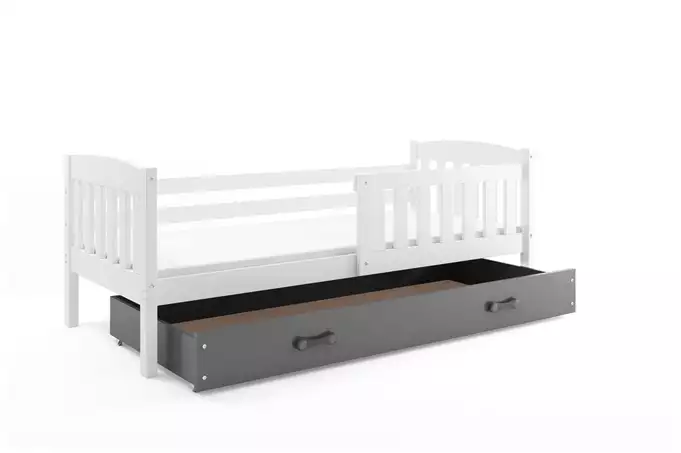 KUBUŚ viengulė jaunimo lova 90×200 su čiužiniu ir stalčiumi, balta/grafito spalvos