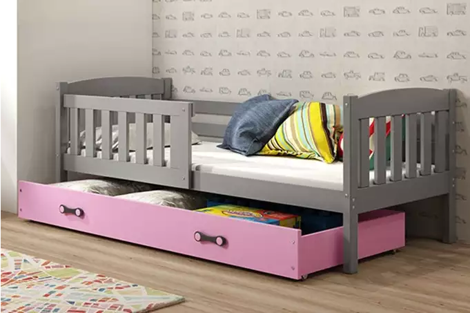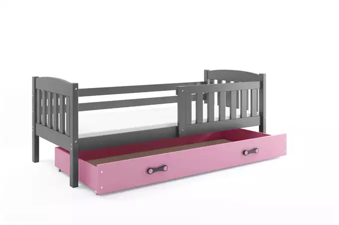 KUBUŚ viengulė jaunimo lova 90×200 su čiužiniu ir stalčiumi, grafito/rožinė