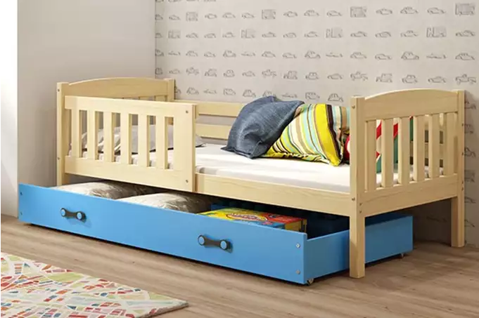 KUBUŚ viengulė jaunimo lova 90×200 su čiužiniu ir stalčiumi, pušis/mėlyna