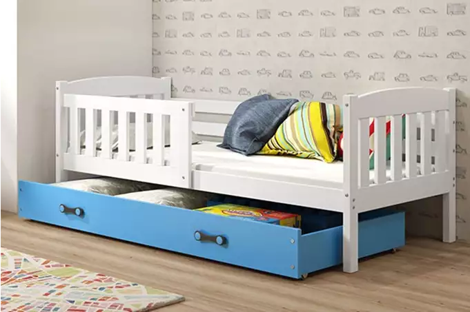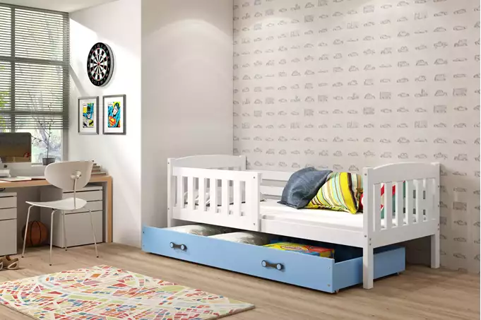 KUBUŚ viengulė jaunimo lova 90×200 su stalčiumi, balta/mėlyna
