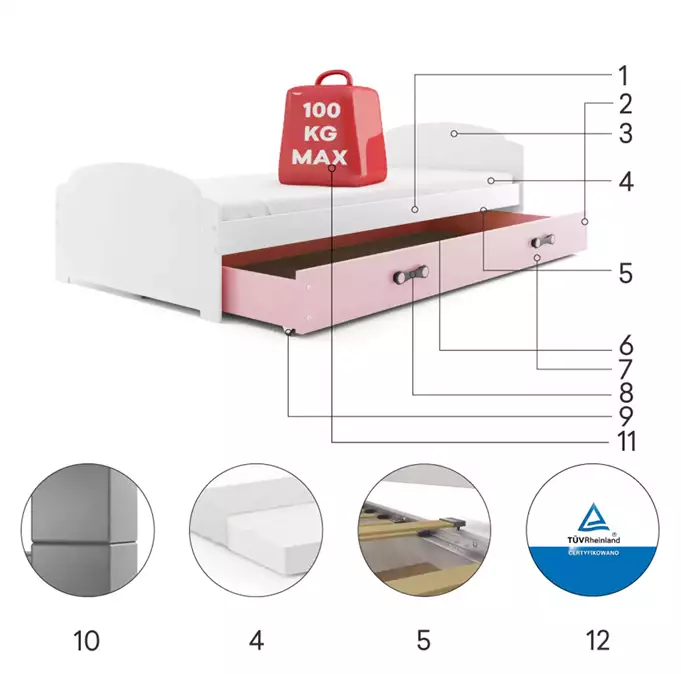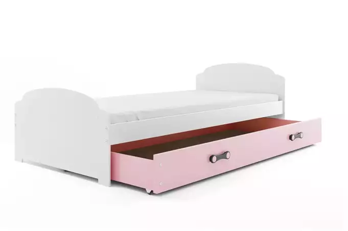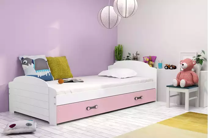 LILI viengulė jaunimo lova 90×200 su stalčiumi, balta/rožinė