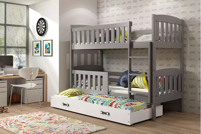 Каркас кровати – изготовлен из сосновой древесины, покрытой лаком на водной основе. Комплектующие для сборки – быстрая и простая сборка. Каркас – мы единственная компания, предлагающая каркас из пружинных березовых ламелей, крепящихся с помощью ПВХ-кронштейна на металлической планке, с использованием системы «клик-клак» (быстрая сборка). Матрасы – 190×90 (2 шт.), 180×80 (1 шт.), со съемным чехлом, из кондиционирующего волокна и пенополиуретана. Чехол – стеганая гипоаллергенная полиэстерная ткань с молнией. Ящик – изготовлен из ламинированной ДСП, имеет дополнительную функцию спального места. Ручка ящика – из ПВХ. Колесики ящика. Закругление – радиус R2. Максимальная нагрузка – 100 кг на ярус. Сертифицированная кровать – качество и безопасность соответствуют стандартам TUV.