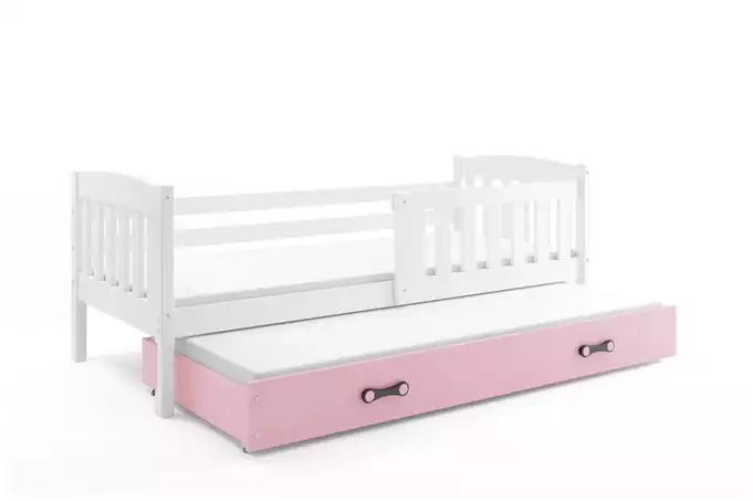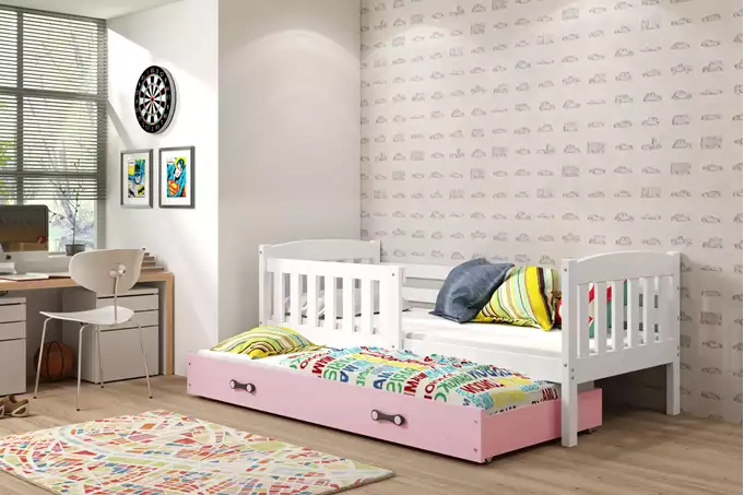 KUBUŚ jaunimo išskleidžiama lova 90×190 su čiužiniu ir stalčiumi, balta/rožinė