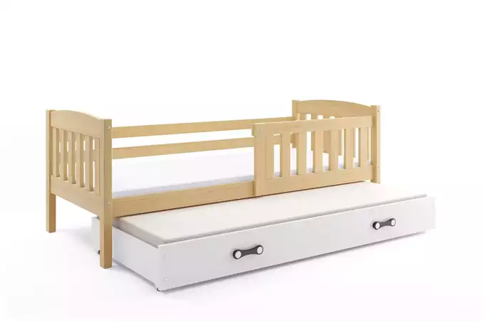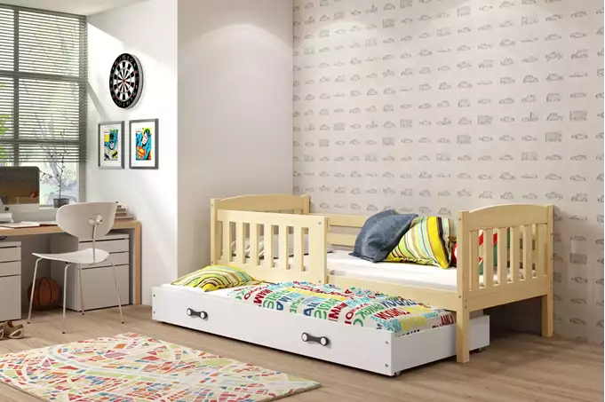 KUBUŚ jaunimo išskleidžiama lova 90×190 su čiužiniu ir stalčiumi, pušis/balta