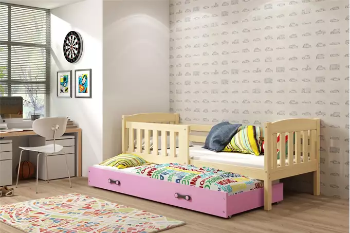 KUBUŚ jaunimo išskleidžiama lova 90×200 su čiužiniu ir stalčiumi, pušis/rožinė
