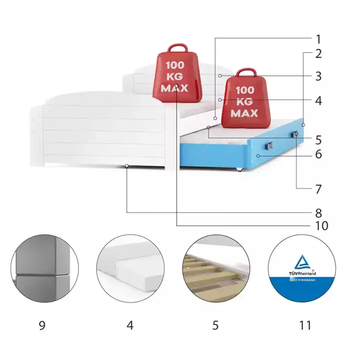 Каркас кровати – изготовлен из сосновой древесины, покрытой лаком на водной основе. Комплектующие – быстрая и простая сборка. МДФ-плита – покрыта лаком на водной основе. Матрасы – 200×90 (1 шт.), 190×80 (1 шт.), со съемным чехлом, из кондиционирующего волокна и пенополиуретана. Чехол – стеганая гипоаллергенная ткань из полиэстера с застежкой-молнией. Каркас – мы единственная компания, предлагающая каркас из пружинных ламелей, изготовленный из березовой древесины, с ручкой из ПВХ на металлической планке, с использованием системы «клик-клак» (быстрая сборка). Ящик – из ДСП, имеет дополнительную функцию спального места. Ручка ящика – из ПВХ. Колесики ящика. Закругление – радиус R2. Грузоподъемность – 100 кг на уровень. Сертифицированная кровать – качество и безопасность соответствуют стандартам TUV.