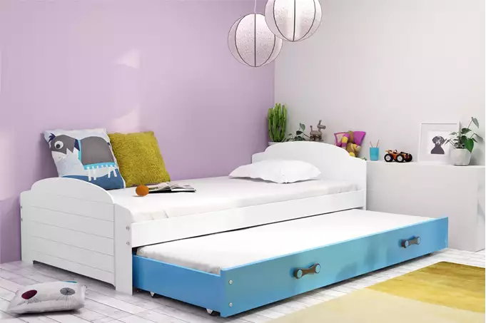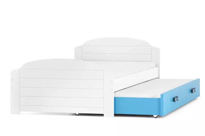 LILI 90X200 jaunimo išskleidžiama lova su čiužiniu ir stalčiumi, balta/mėlyna
