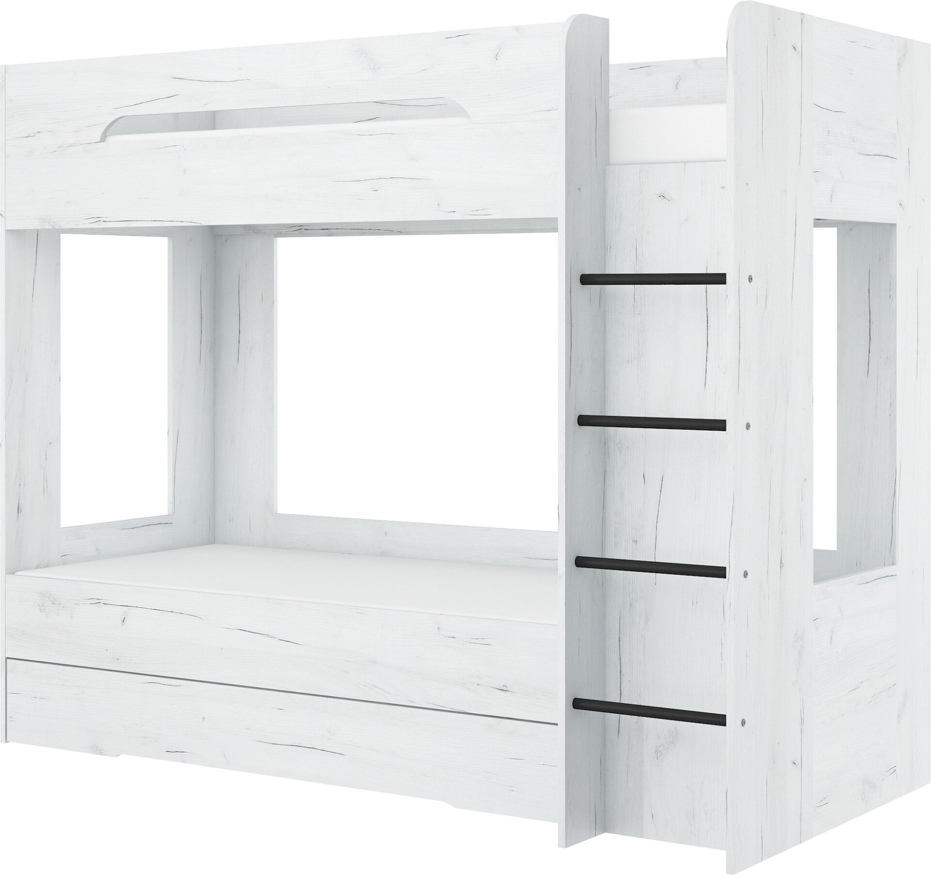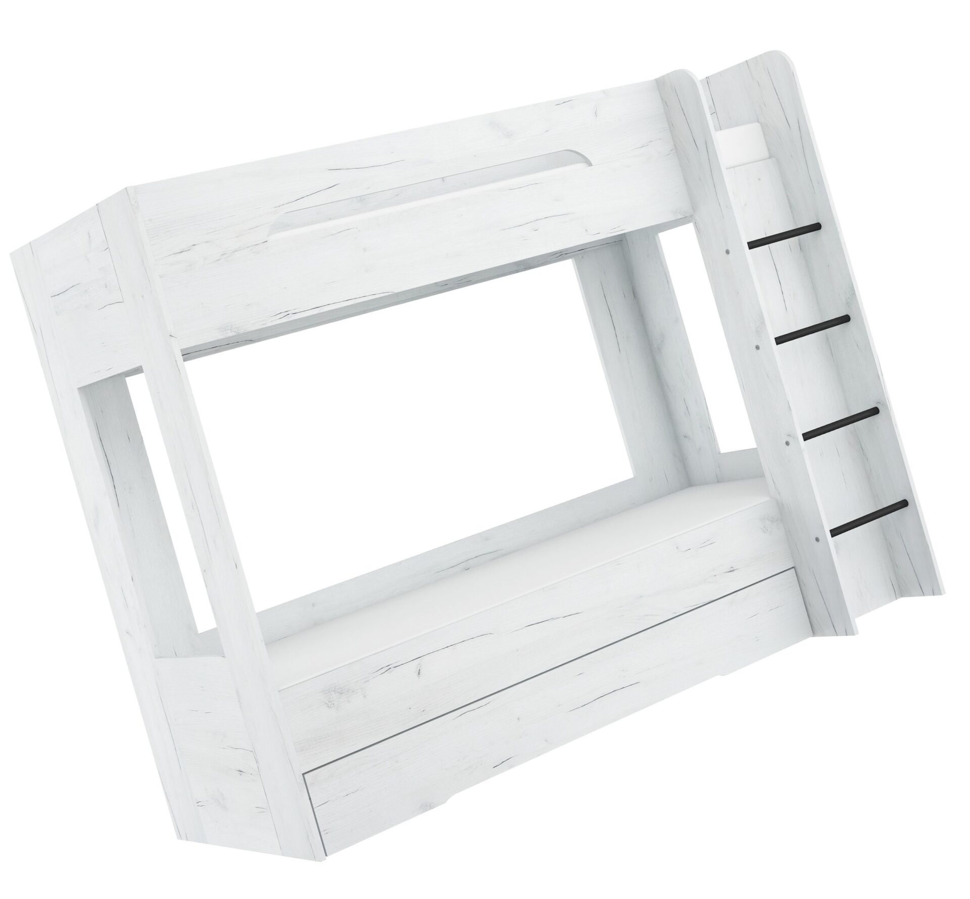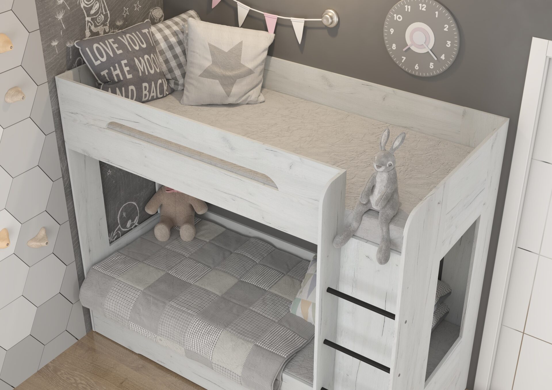 Двухъярусная кровать BLIN без матрасов, 80×200 см. Доска 16 мм, кромка из ABS-пластика, максимальная высота матраса 12 см. Цвет: белый дуб.