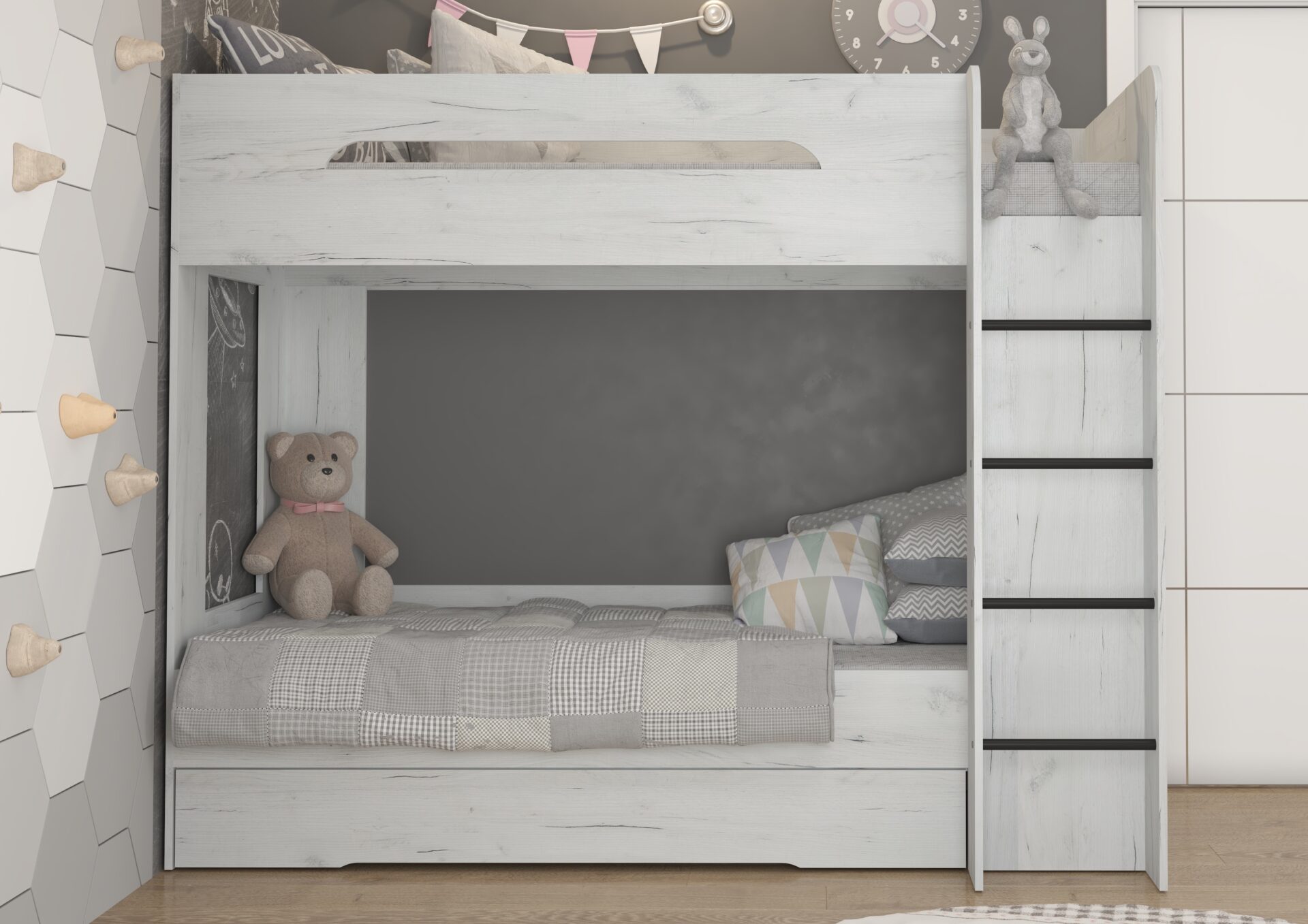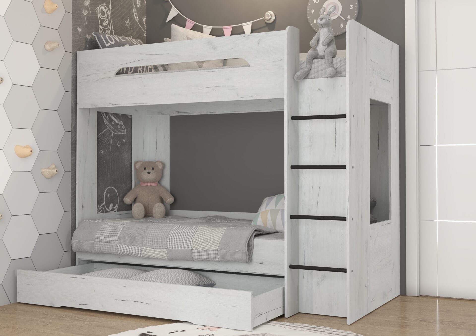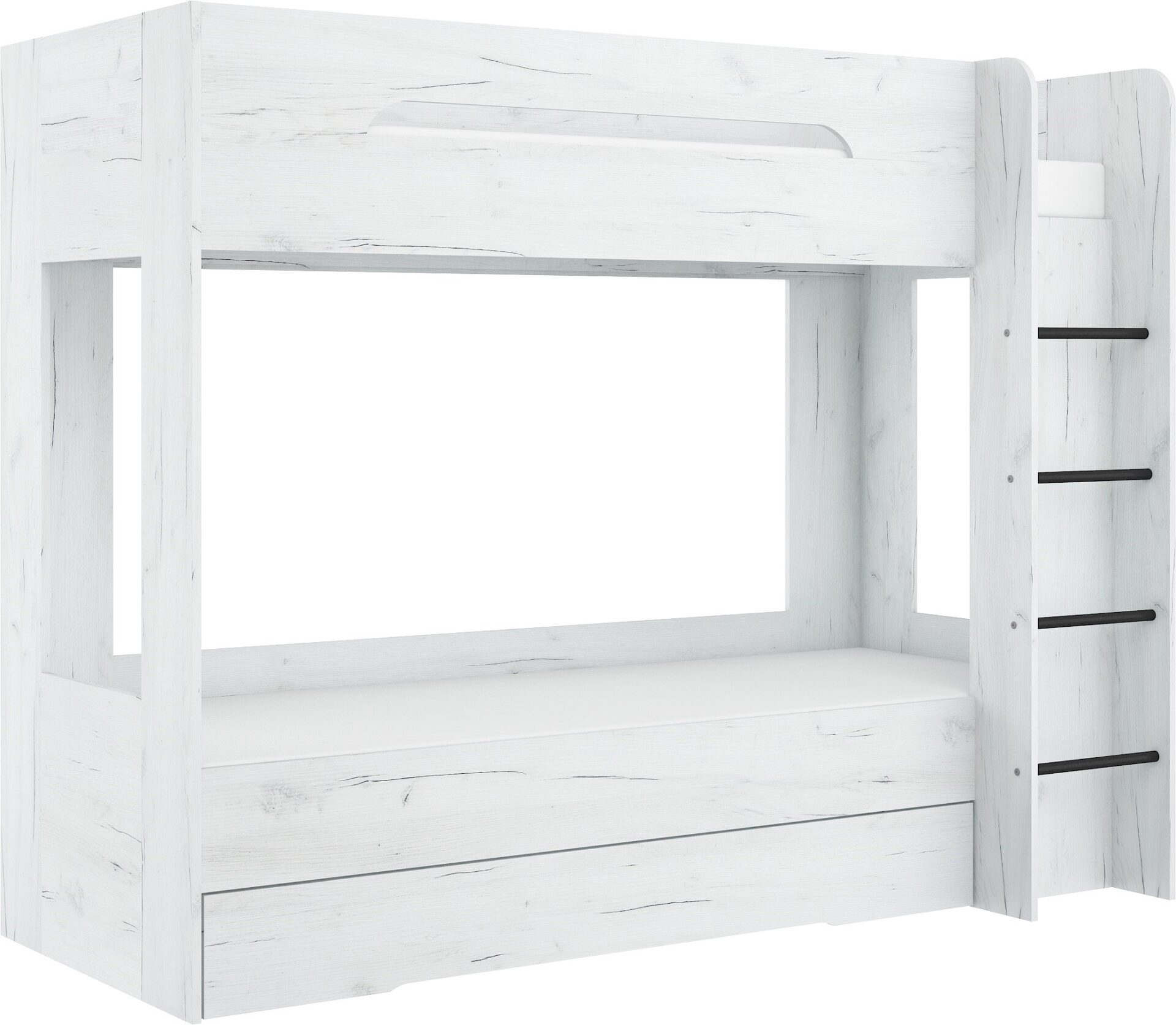 Двухъярусная кровать BLIN без матрасов, 80×200 см. Доска 16 мм, кромка из ABS-пластика, максимальная высота матраса 12 см. Цвет: белый дуб.