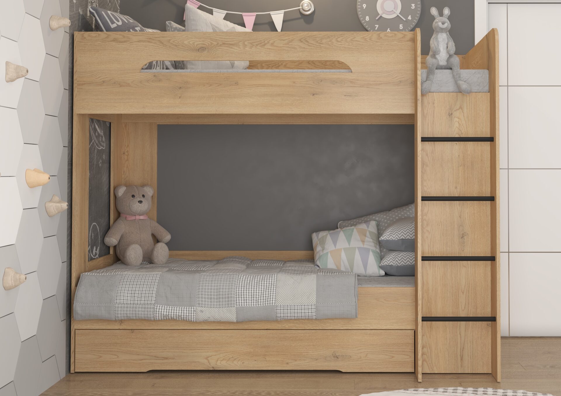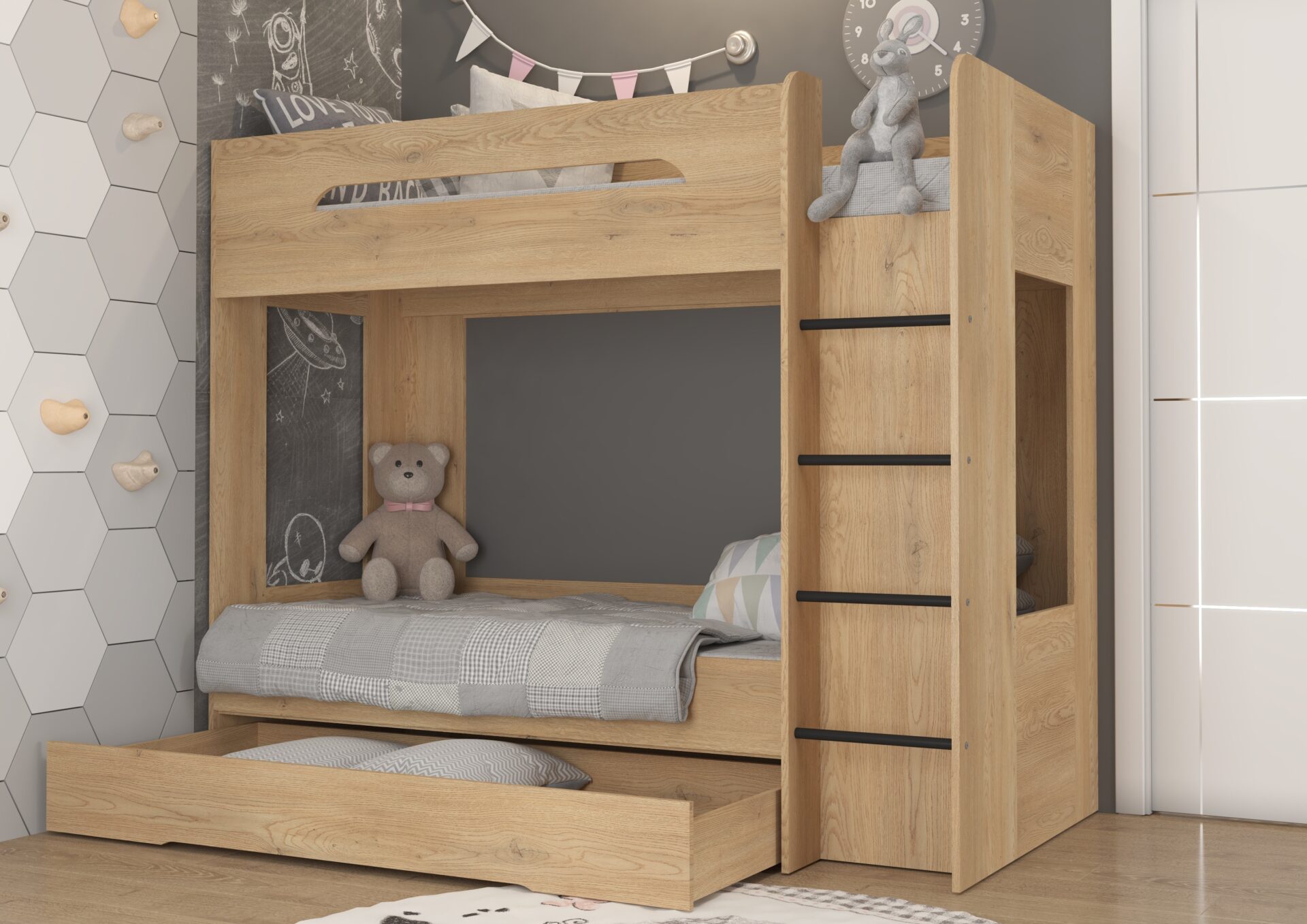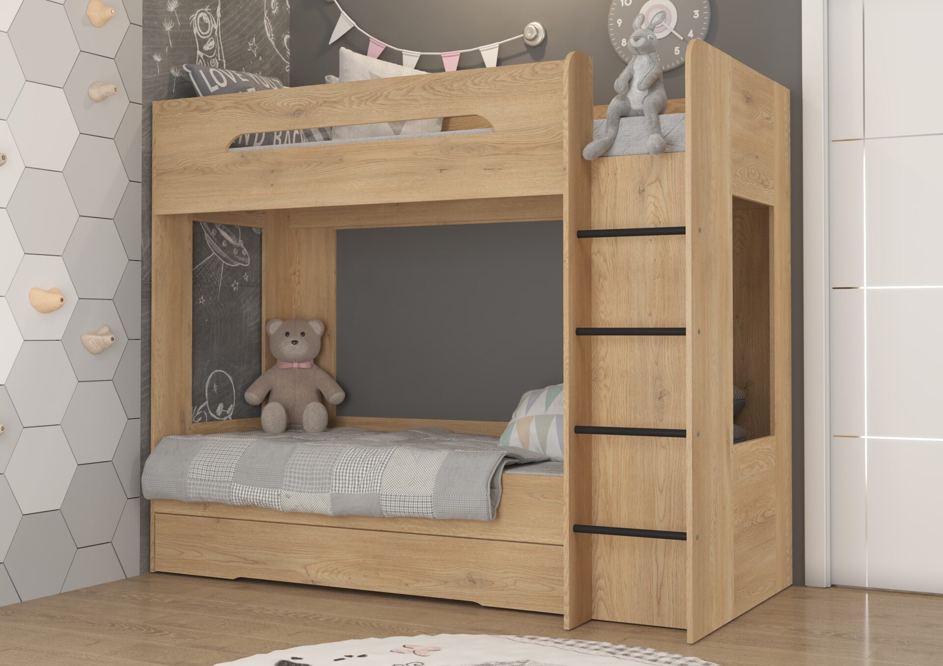 Двухъярусная кровать BLIN без матрасов, 80×200 см. Доска 16 мм, кромка из ABS-пластика, максимальная высота матраса 12 см. Цвет: кремовый дуб.