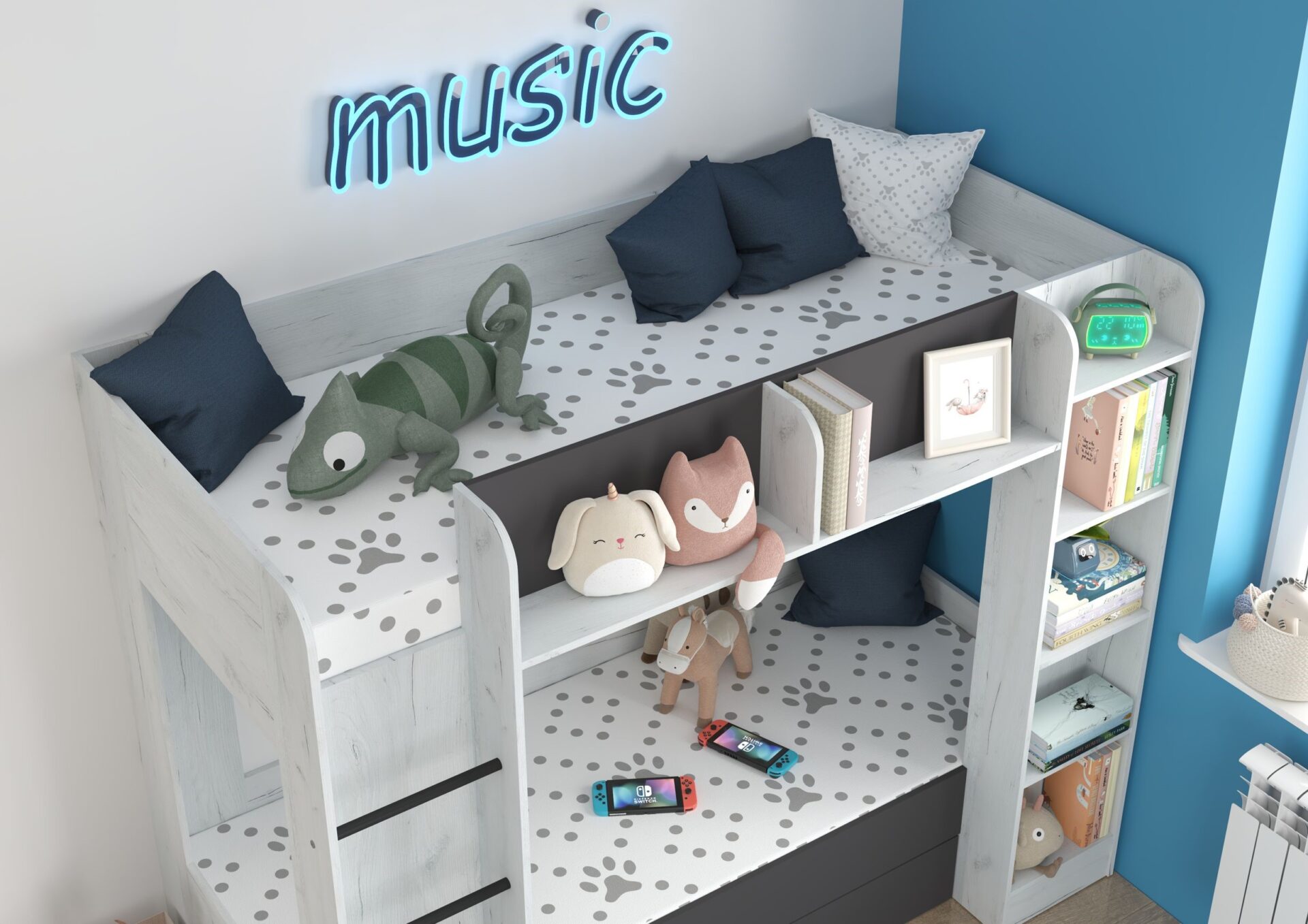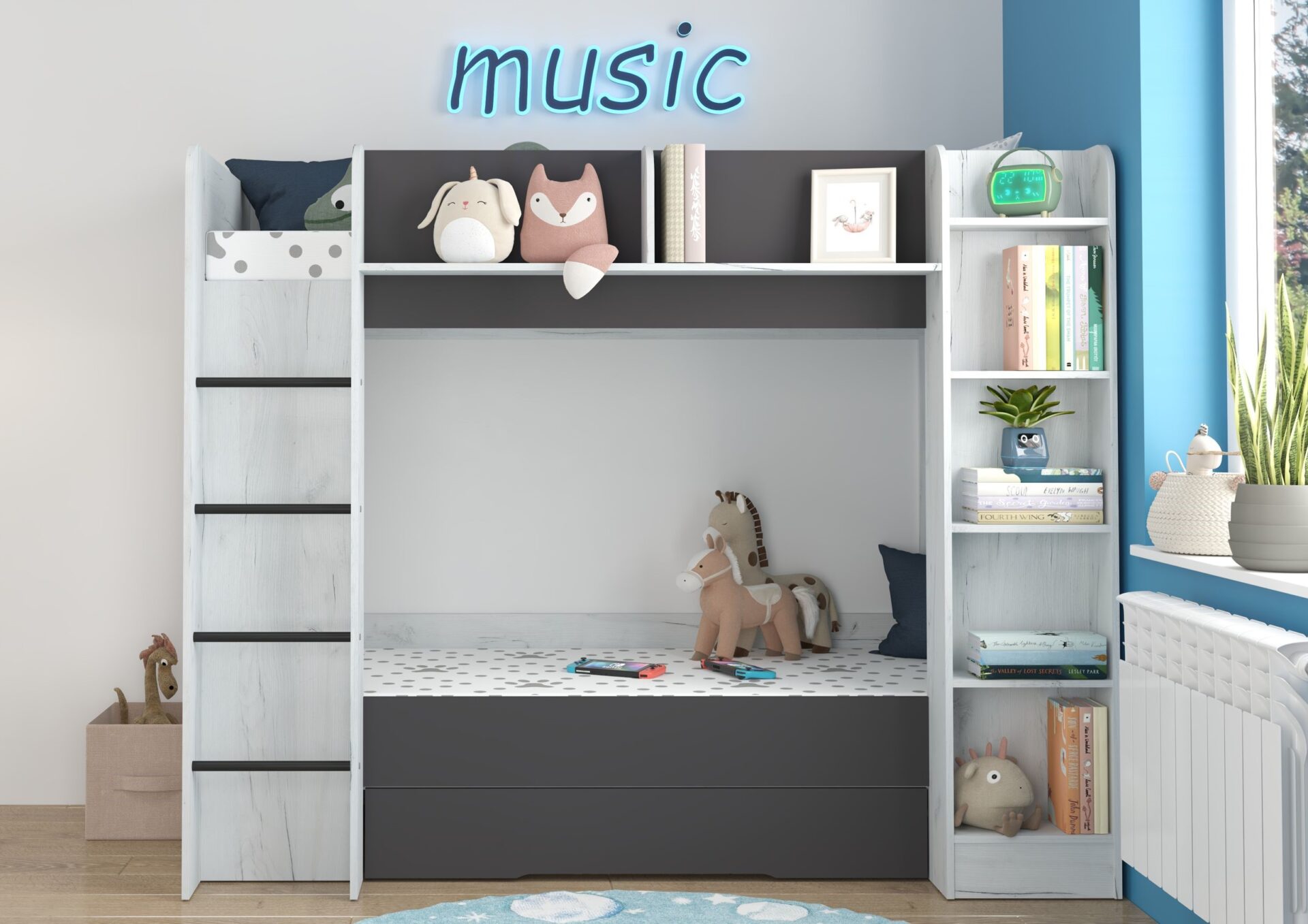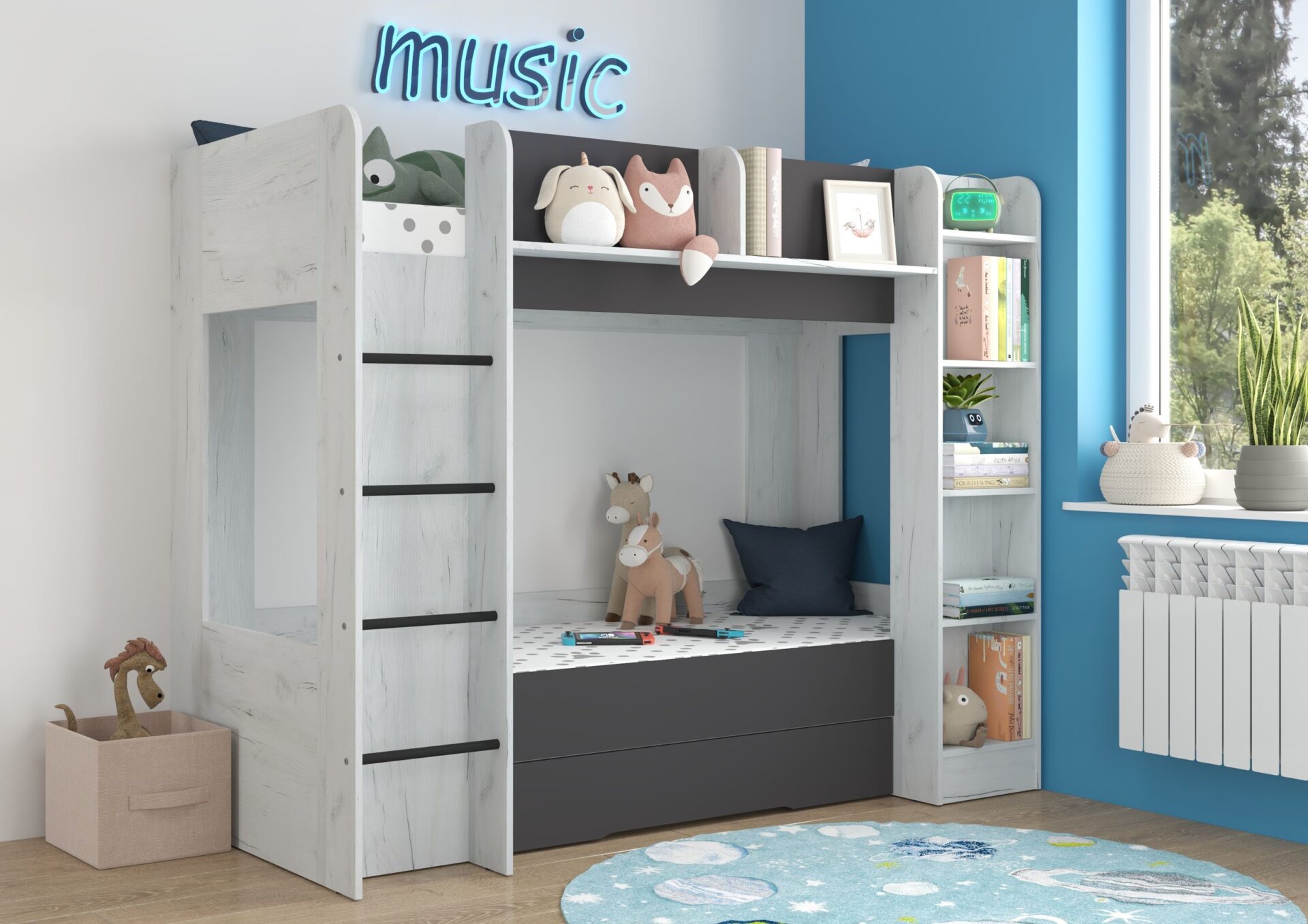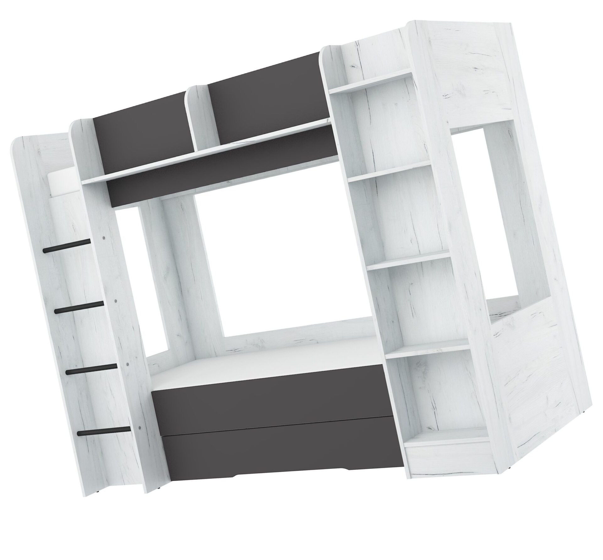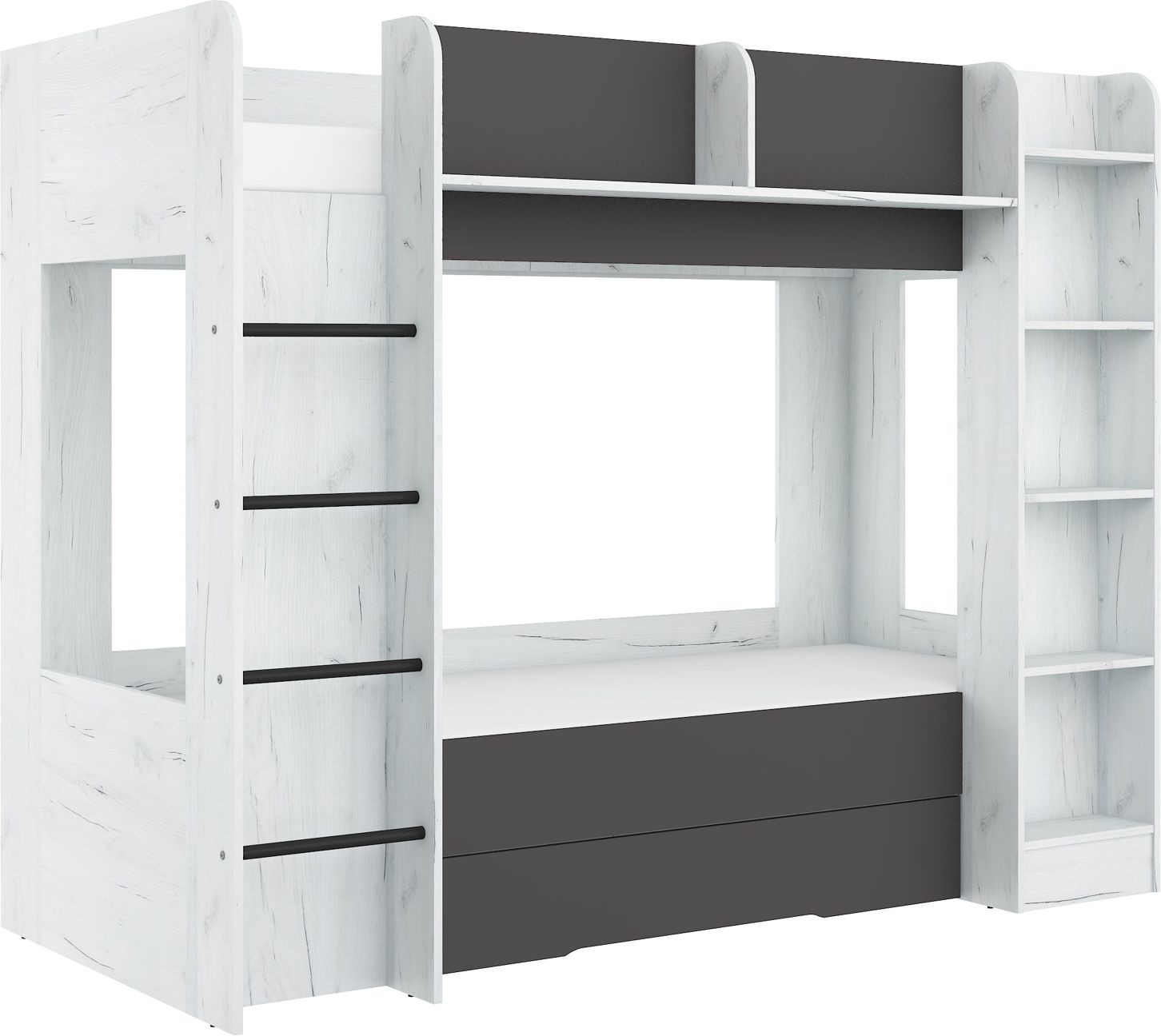 Двухъярусная кровать EVEST без матрасов, 80×200 см. Доска 16 мм, кромка из ABS-пластика, максимальная высота матраса 12 см. Цвет: белый дуб / графит.