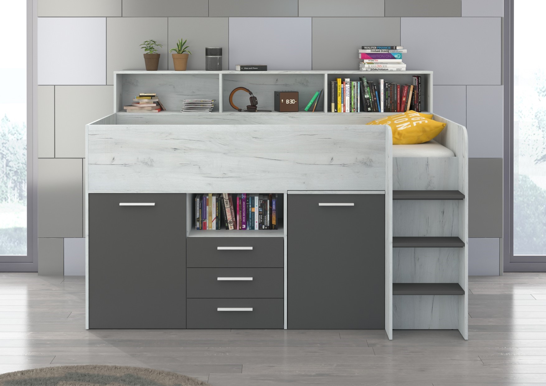 Мезонин ENO P без матраса. ДСП толщиной 16 мм, кромка из ABS-пластика, система плавного закрывания ящиков и шкафов, максимальная высота матраса 12 см, цвет: белый дуб/графит.