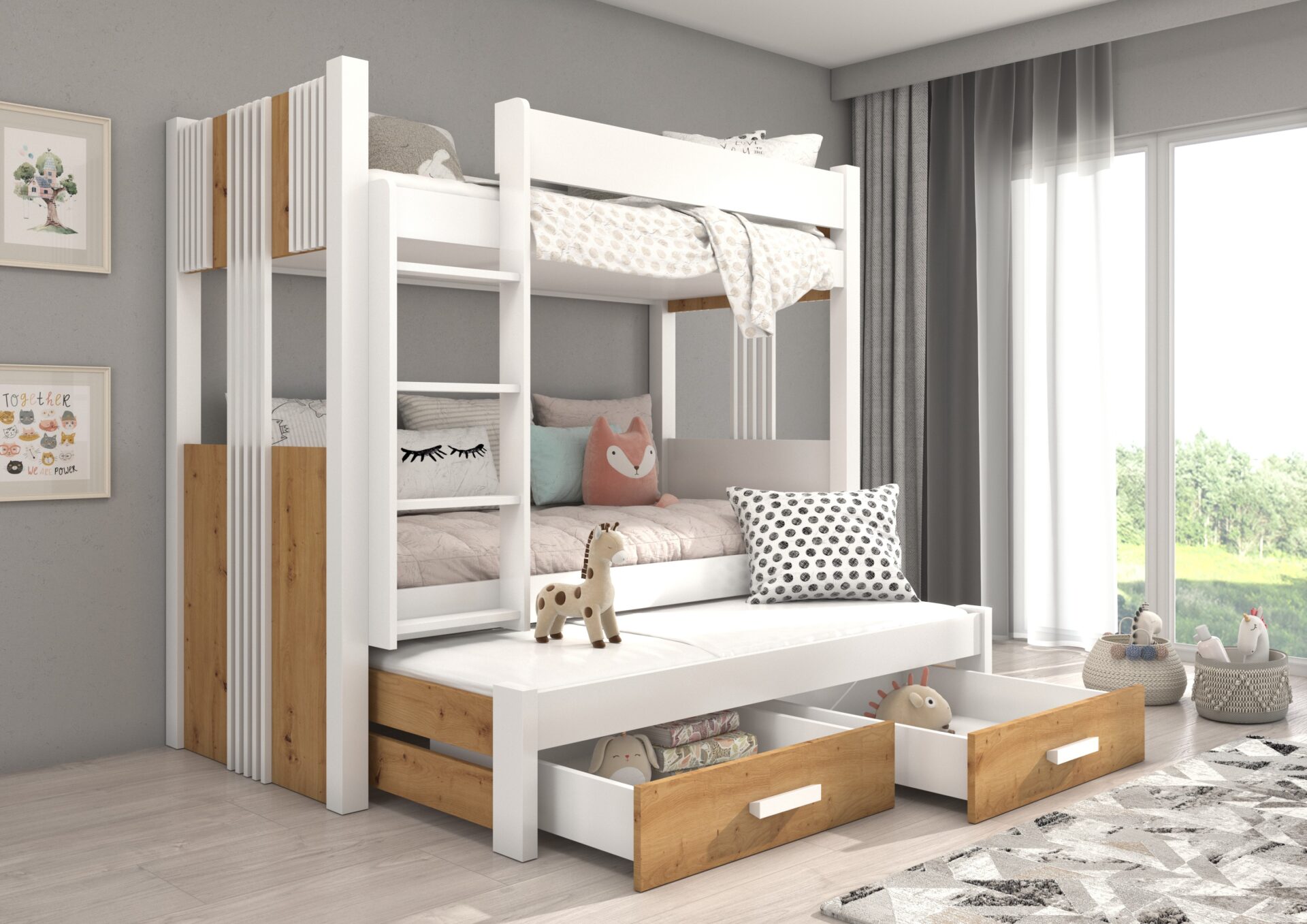 Trivietė dviaukštė lova su ARTEMA 180×80 čiužiniais, balta/Artisan ADRK