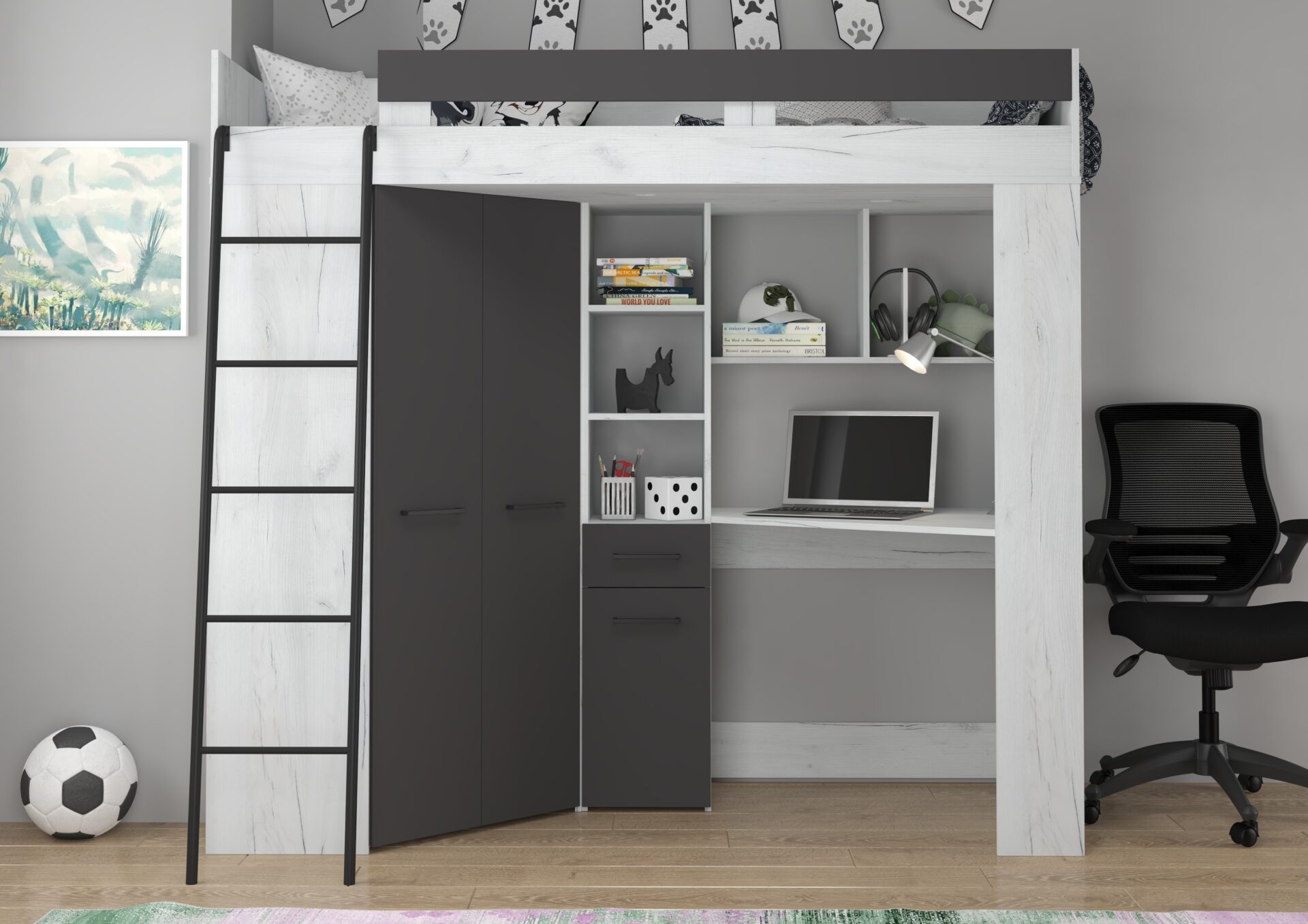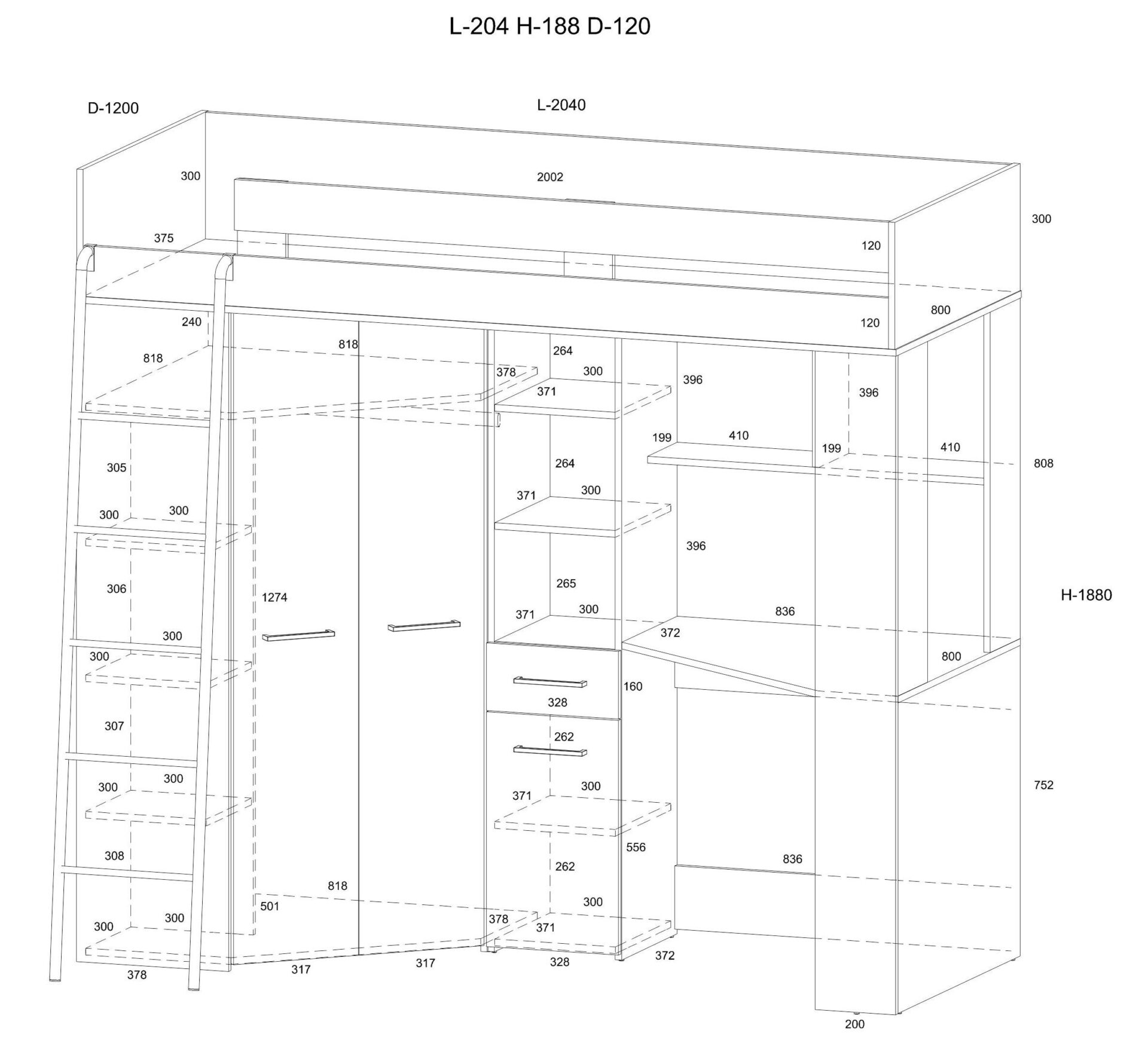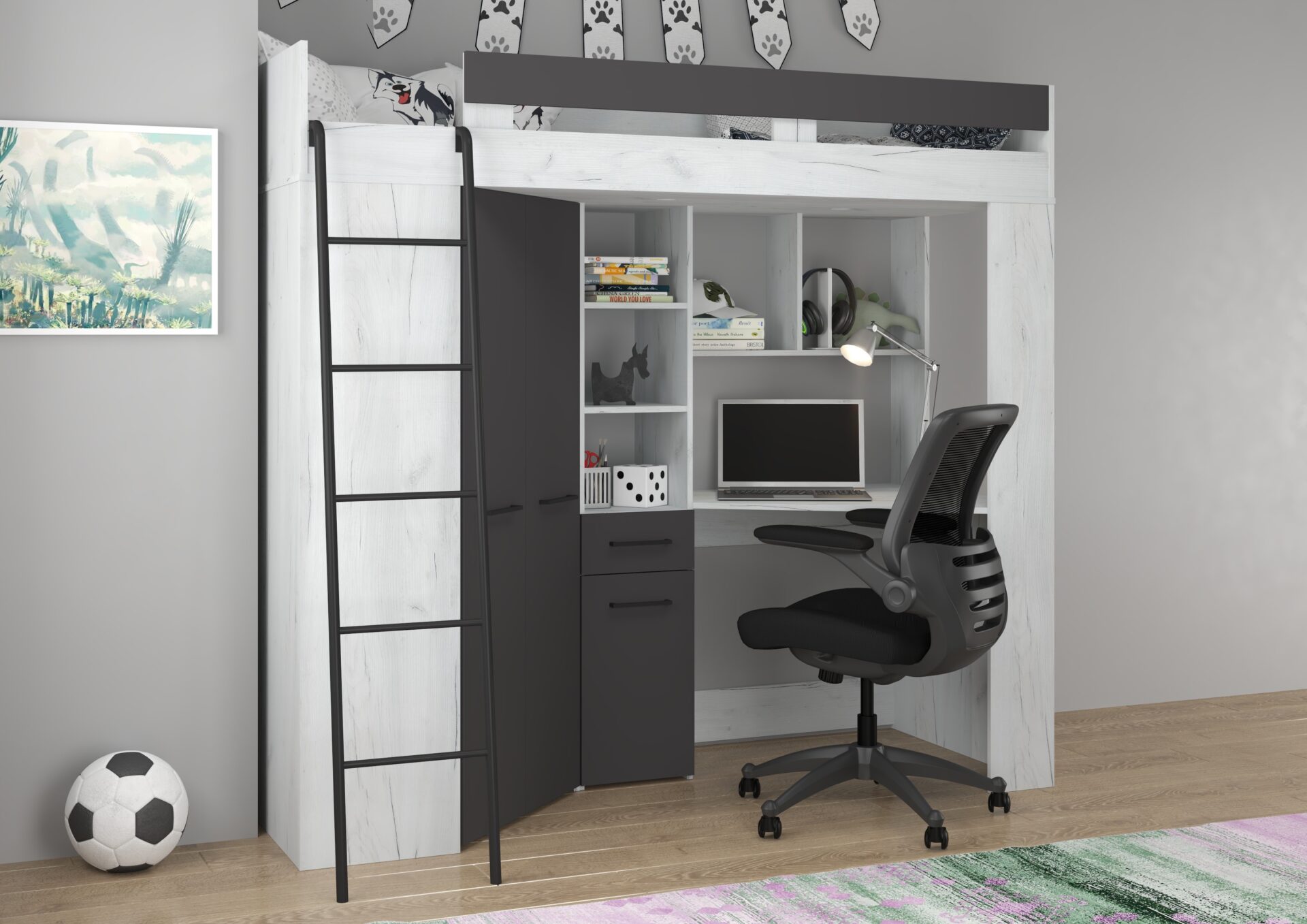 Антресоль FLO L без матраса 80×200, плита 16 мм, кромка из ABS-пластика, бесшумное открывание, максимальная высота матраса 12 см, цвет: белый дуб / графит