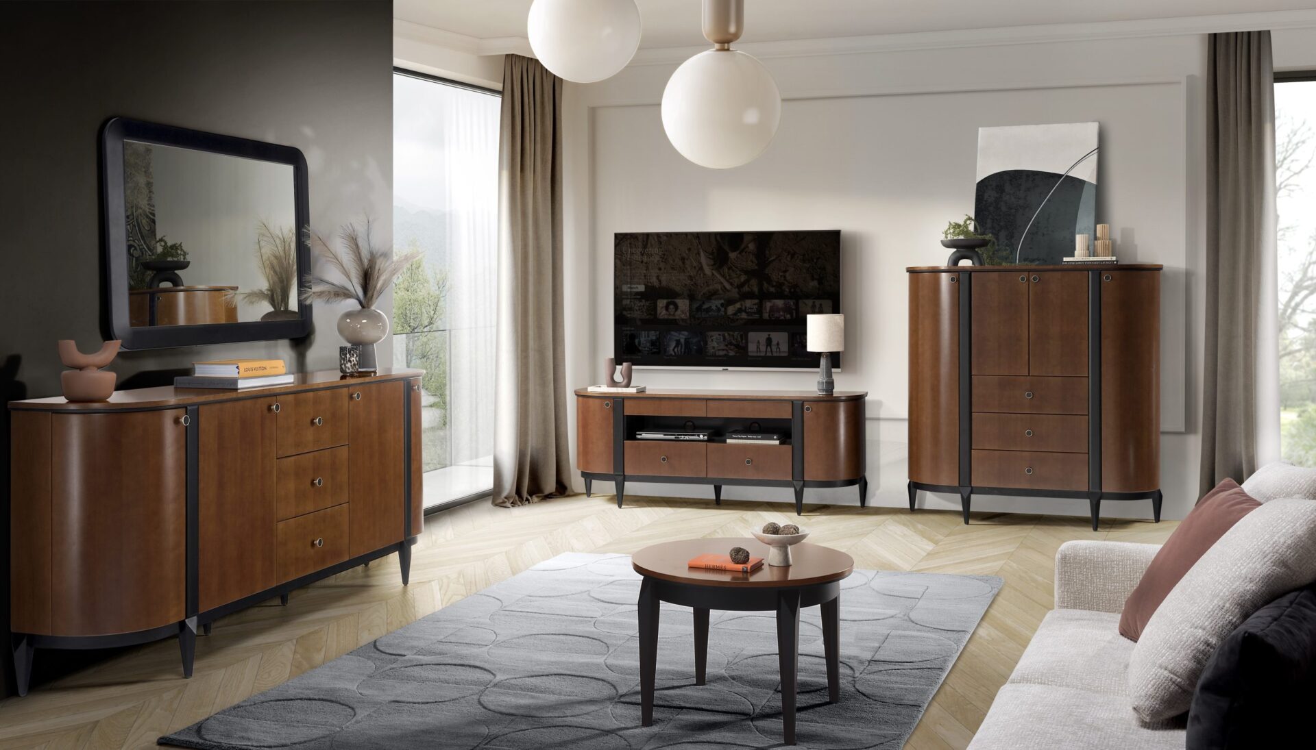 Коллекция сочетает в себе вневременной, мягкий ореховый цвет с матовым черным цветом. Окрашенный МДФ. Витрины с подсветкой. Стиль ар-деко триумфально возвращается. Контрастные элементы этого стиля привлекают внимание и надолго остаются в памяти. Стиль ар-деко существует уже более ста лет! Этот стиль — сочетание любви к искусству и богатого декора, который раскрывает истинную красоту даже обычных предметов повседневного обихода.