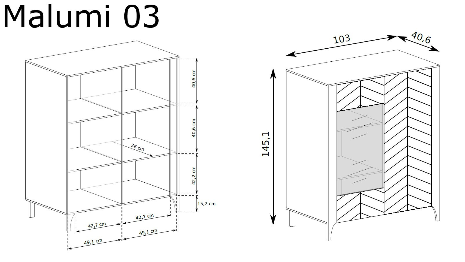 Добавьте в свой интерьер нотку современности и элегантности с помощью нашего шкафа-витрины MALUMI-3, который идеально сочетает в себе функциональность и изысканный дизайн. Изготовленный из высококачественной ламинированной плиты, черный шкаф-витрина Painflow привлекает внимание и подходит для различных вариантов расстановки мебели. Тонкий узор «елочка» на фасадах придает ему неповторимый характер, делая его ключевым акцентом в вашем доме. Идеально подходящий для демонстрации ваших любимых предметов, шкаф-витрина MALUMI-3 имеет просторные полки, которые помогут организовать и выставить книги, украшения или элегантную посуду. Его минималистичный стиль подходит как для современных, так и для классических интерьеров, добавляя изысканности и стиля. Черные ножки обеспечивают не только красивый внешний вид, но и устойчивость и безопасность использования. Функциональность шкафа-витрины повышается благодаря механизму Push to Open, который позволяет легко открывать дверцы без лишних ручек. Петли с доводчиками обеспечивают удобство использования, а также улучшают эстетический вид мебели. Шкаф-витрина будет отлично смотреться в гостиной, столовой или офисе, добавляя элегантности пространству и помогая организовать ваши любимые вещи.
