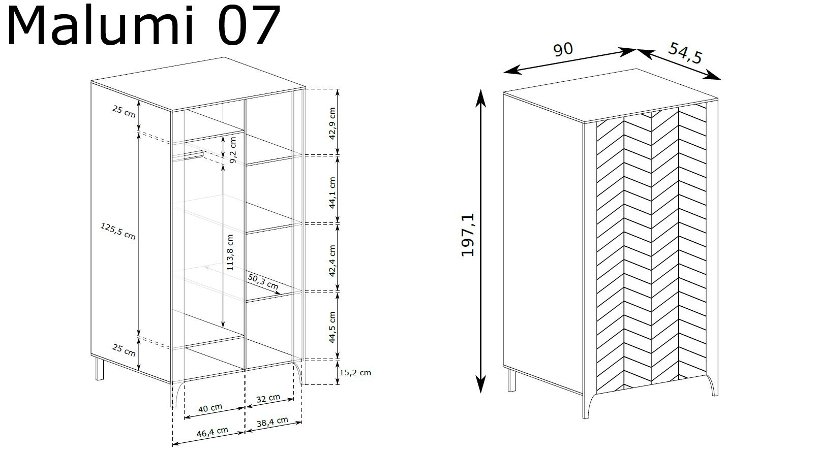 Шкаф MALUMI-7 сочетает в себе элегантность и функциональность. Изготовленный из высококачественной матовой мебельной плиты, его черный каркас с геометрическим узором «елочка» привнесет современный штрих в любой интерьер. Сочетая минималистичный дизайн с практичными решениями, этот шкаф становится не просто предметом мебели, а настоящим произведением искусства. Его пропорции – 90 см в ширину, 197 см в высоту и 54,5 см в глубину – позволяют шкафу MALUMI-7 идеально вписаться как в небольшие, так и в большие помещения, сохраняя при этом эстетически привлекательный внешний вид. Разработанный с учетом организации пространства, шкаф предлагает идеальное место для вешалок, четыре полки и нижнюю секцию для обуви, сумок и других аксессуаров. Такой подход к хранению, безусловно, упростит повседневную жизнь. Как и подобает современному предмету мебели, шкаф оснащен системой открывания «нажатием», что делает его еще более функциональным. Вам больше не нужно искать ручки – достаточно легкого прикосновения, чтобы открыть двери. Дополнительным преимуществом являются бесшумные петли, обеспечивающие плавную работу. Это решение идеально подходит для людей, которые ценят спокойствие при повседневном использовании мебели.
