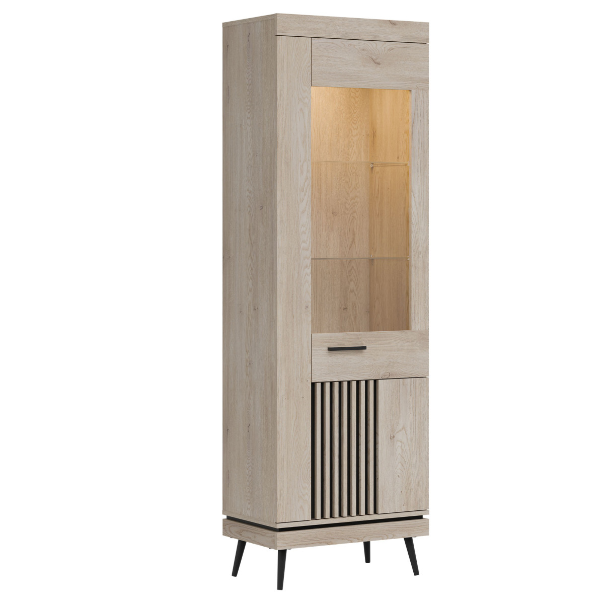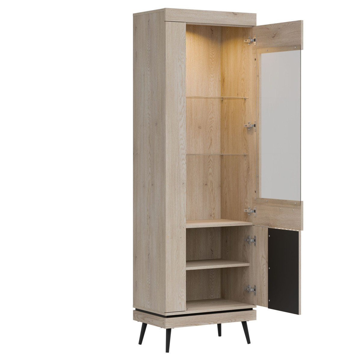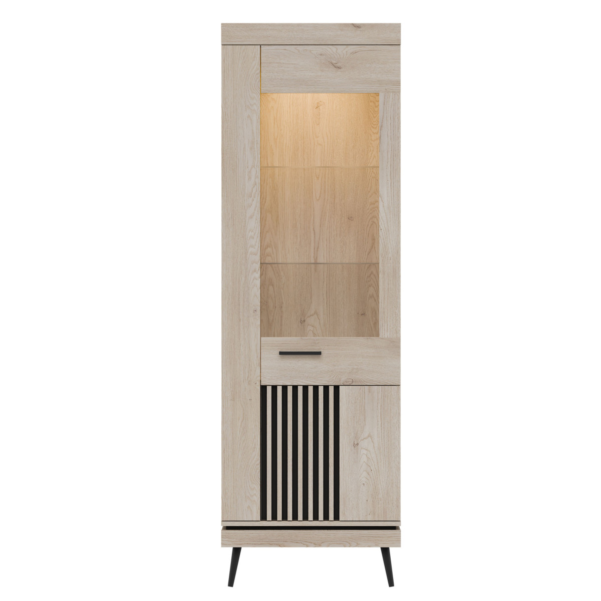 Наша витрина MI07 отличается изысканной цветовой гаммой из дуба цвета кремовой котты и черного цвета, представляя собой идеальное сочетание современного дизайна и классического стиля. Каждый элемент нашей витрины тщательно изготовлен в соответствии с высочайшими стандартами качества. Точная отделка, прочная конструкция и внимание к мельчайшим деталям гарантируют, что изделие прослужит долгие годы, не теряя своего очарования. Для тех, кто хочет добавить еще больше уникальности своему интерьеру, мы предлагаем дополнительную подсветку. Мягкое освещение, ненавязчиво интегрированное в конструкцию витрины, подчеркивает красоту представленных предметов, создавая теплую и уютную атмосферу.