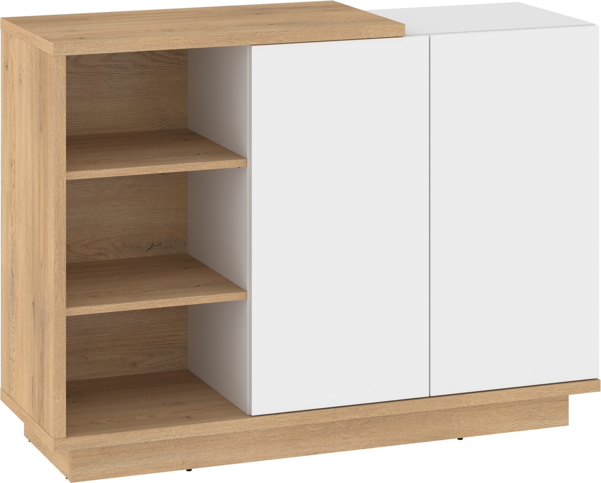 BRITA 05 baldai, komoda su durelėmis ir lentynomis, kremonos ąžuolas, balta blizgi spalva