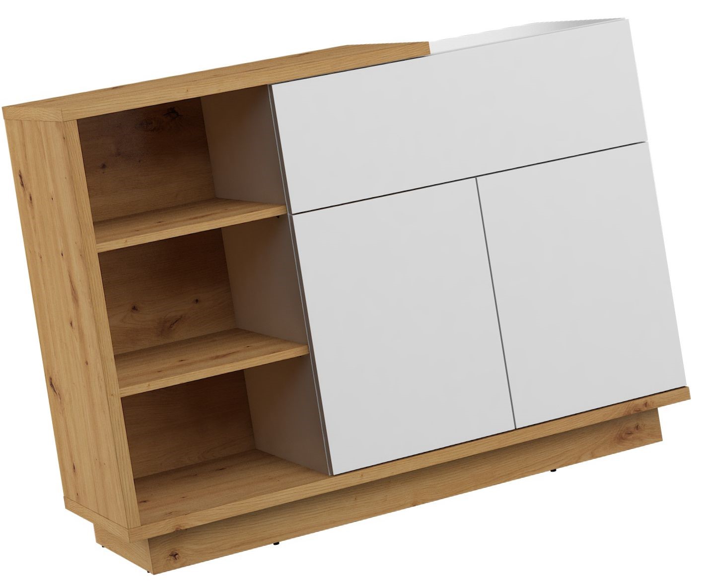 BRITA 06 baldai, komoda su lentynomis ir durelėmis, dirbtinio ąžuolo spalvos, baltai blizgi