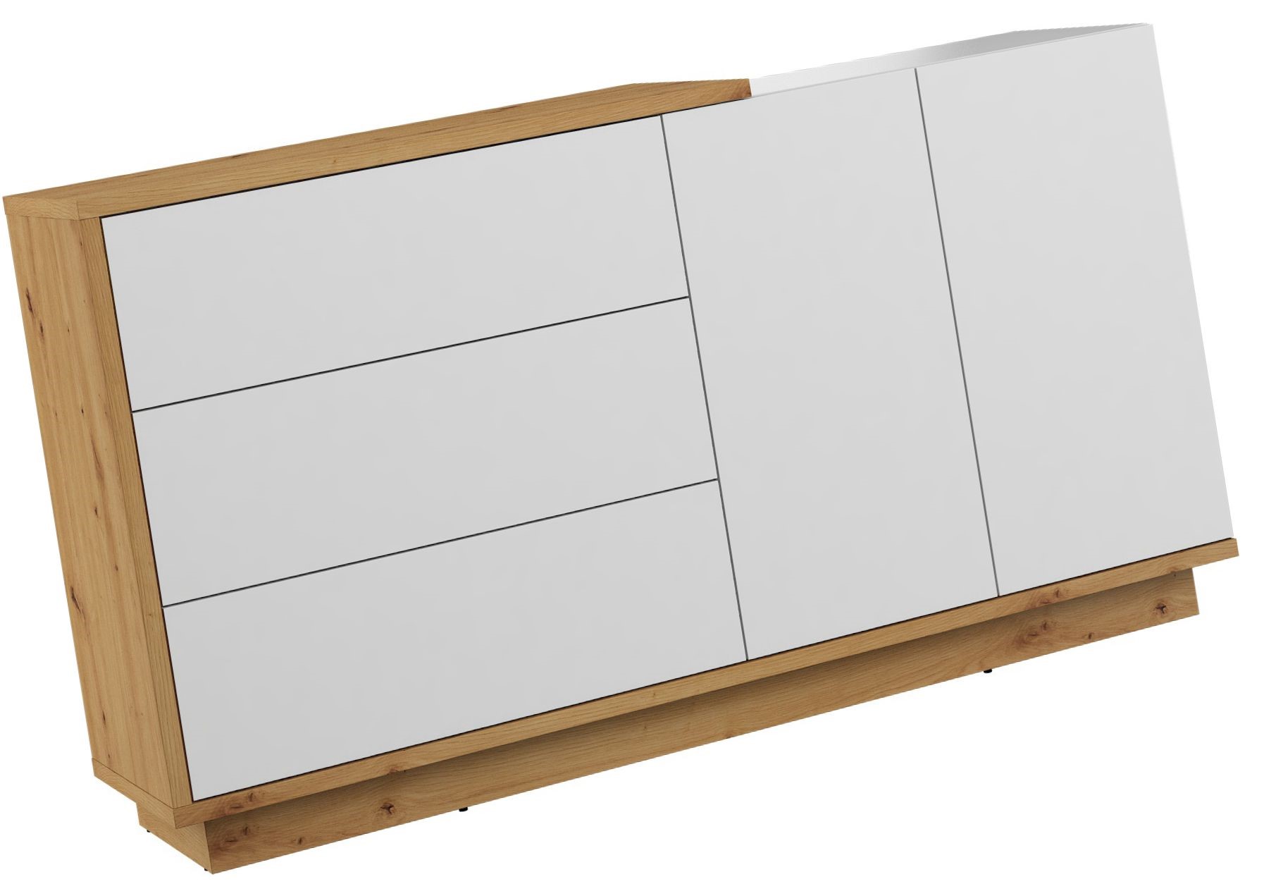 BRITA 07 baldų didelė komoda su durelėmis, ąžuolo dirbiniai, balta blizgi spalva