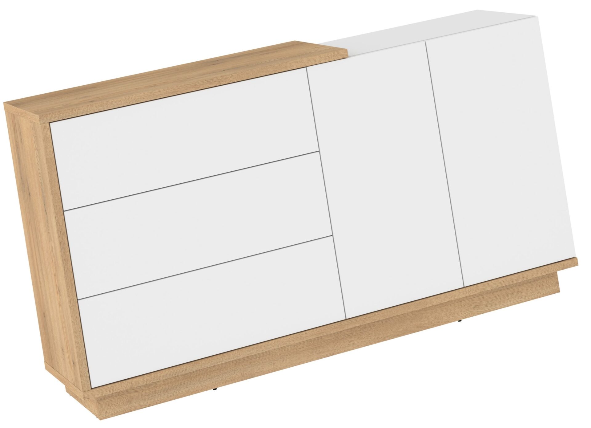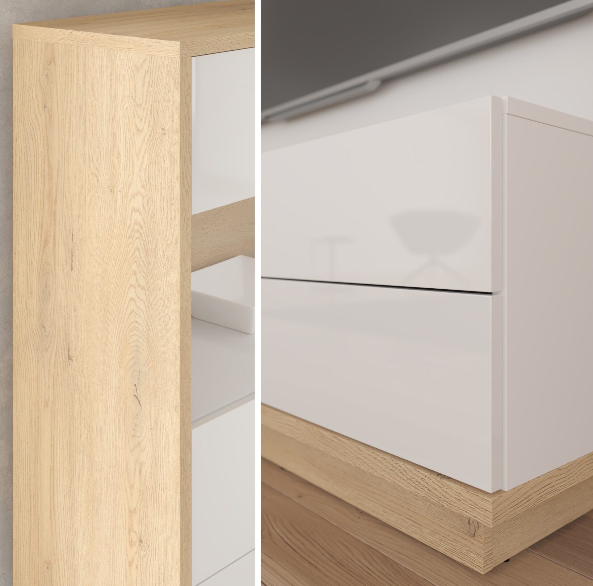 BRITA 07 didelė komoda su durelėmis, pagaminta iš kremonos ąžuolo, blizgios baltos spalvos