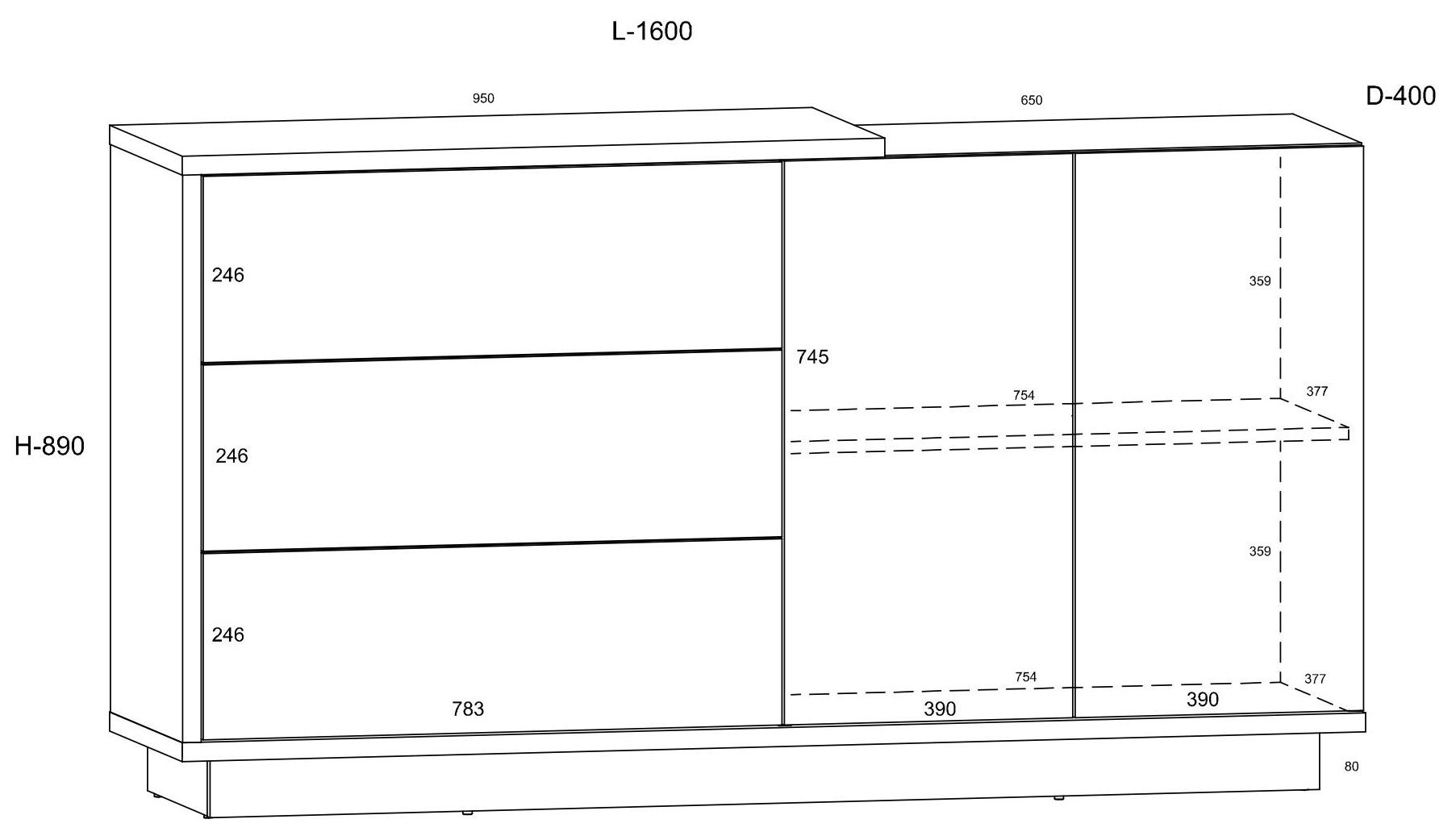 Мебель изготовлена из ДСП толщиной 16 мм и 25 мм с кромкой из АБС-пластика. Ящики и дверцы открываются нажатием. Высота тумбы составляет 8,5 см.