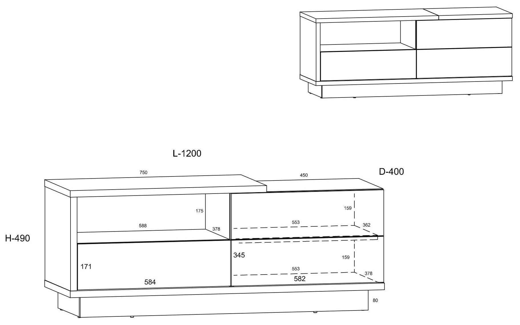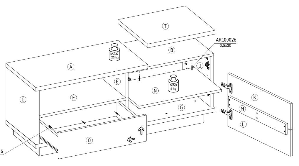 Мебель изготовлена из ДСП толщиной 16 мм и 25 мм с кромкой из АБС-пластика. Ящики и дверцы открываются нажатием. Высота тумбы составляет 8,5 см.