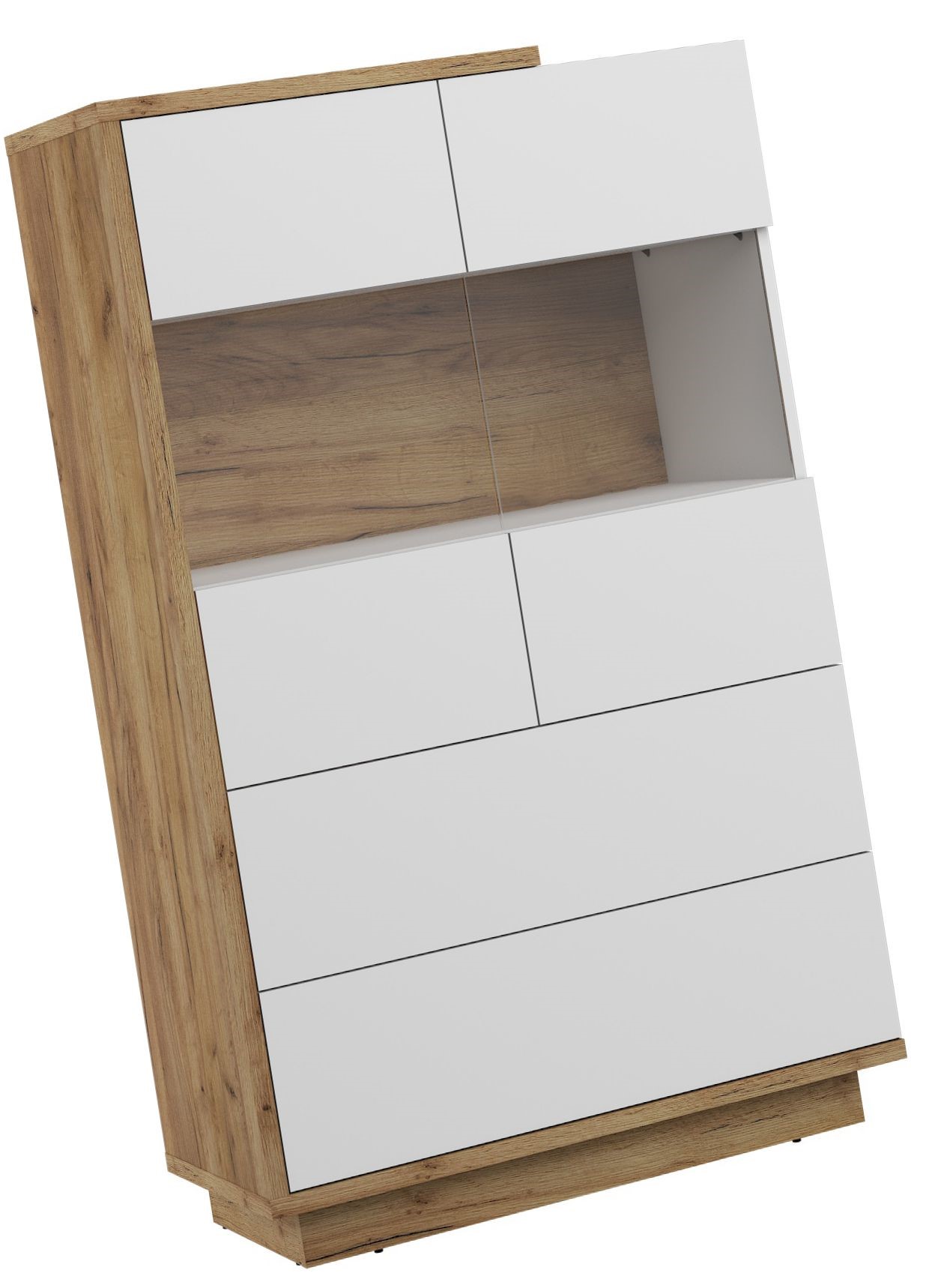 BRITA 28 baldų žema vitrina su stalčiais svetainei, ąžuolo spalvos, aukso spalvos, balta