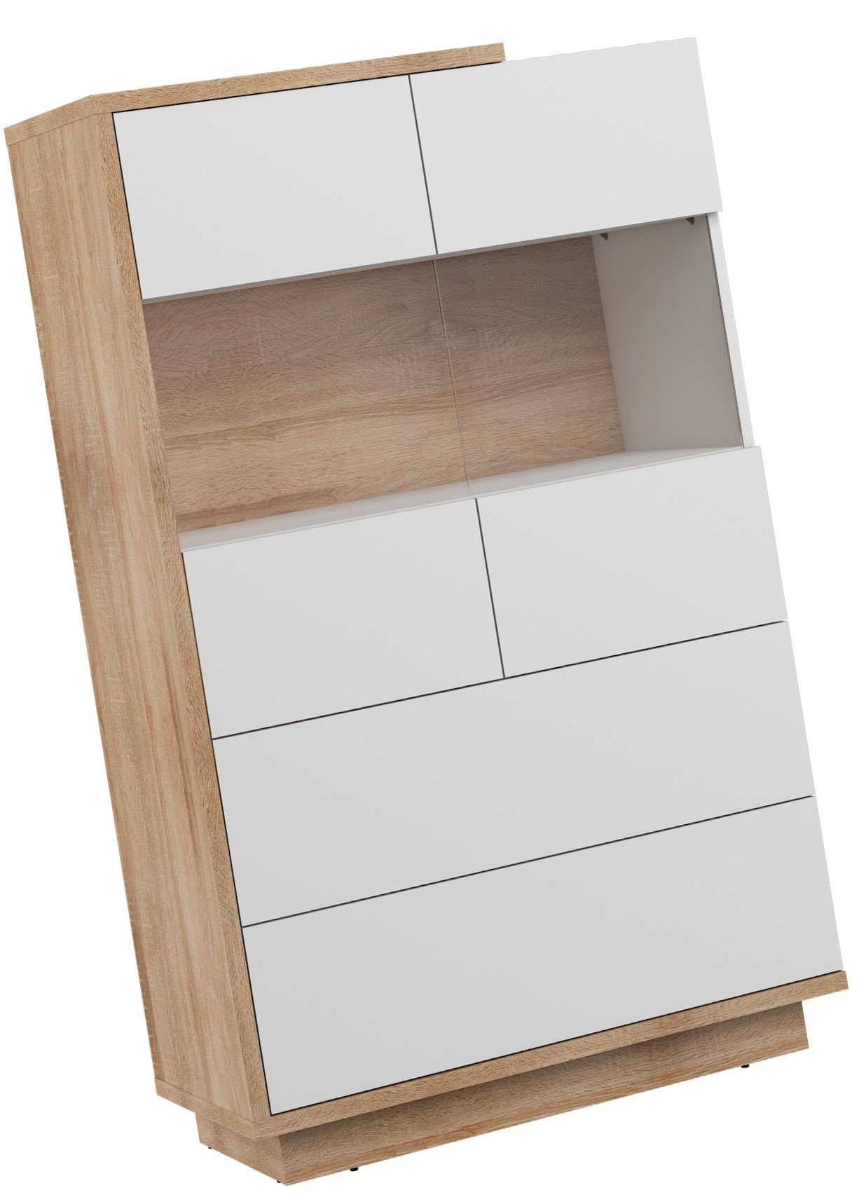 BRITA 28 žema vitrina su stalčiais svetainei, Sonoma ąžuolas, balta poliruota